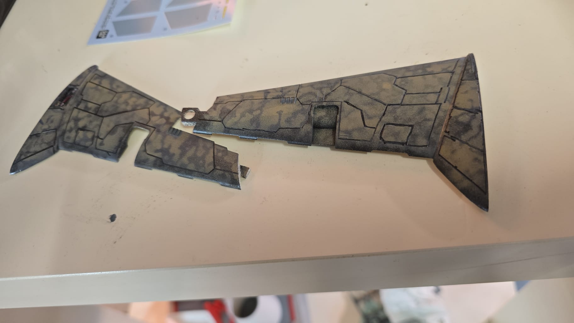 War ne Fummelarbeit, aber der Plan ging auf. Abgeklebt mit BMF (Bare Metal Foil). Nach dem Überlackieren mit Schwarz war es schon sehr fummelig, das BMF wieder abzuziehen. Aber es hat geklappt.