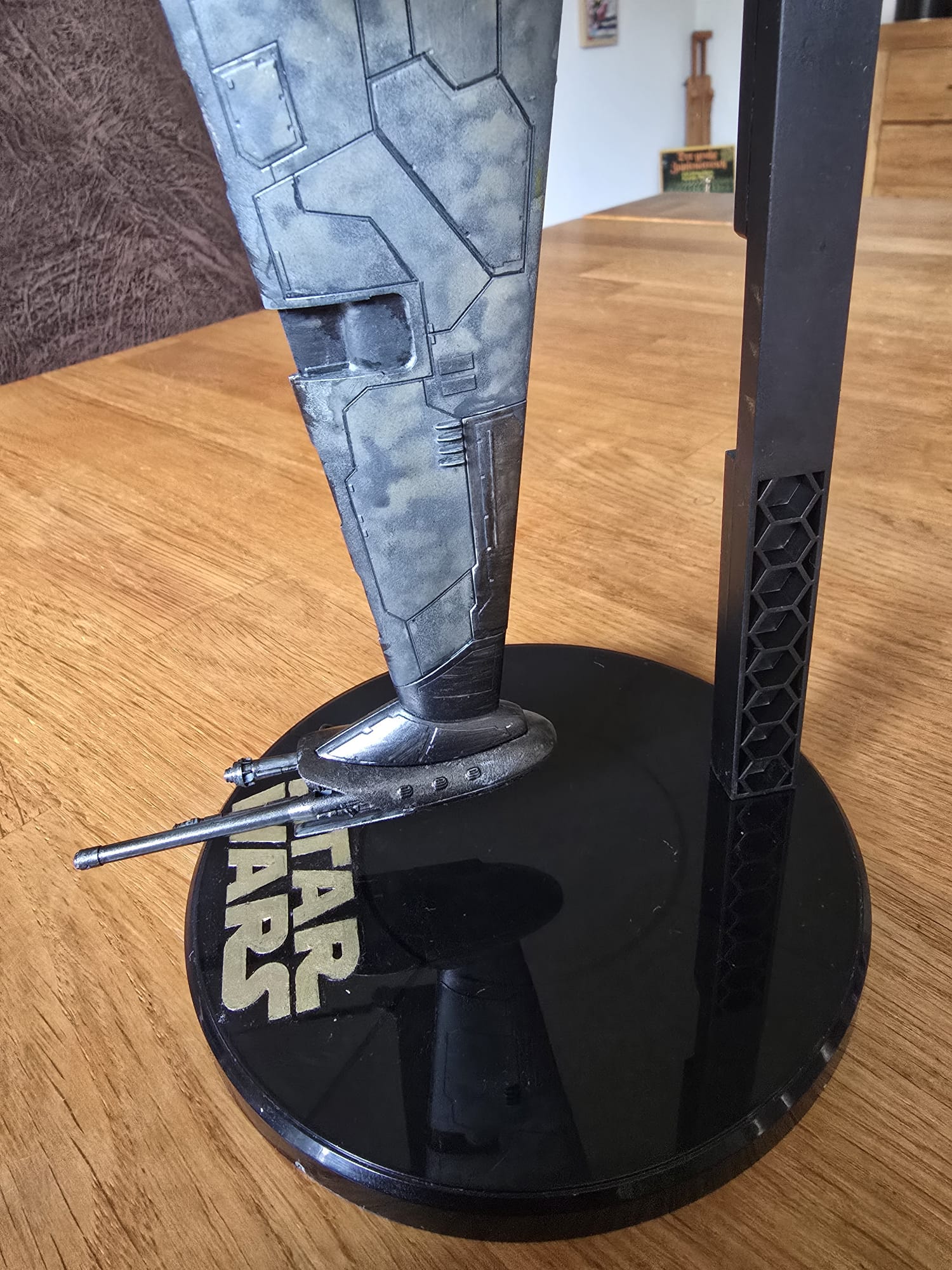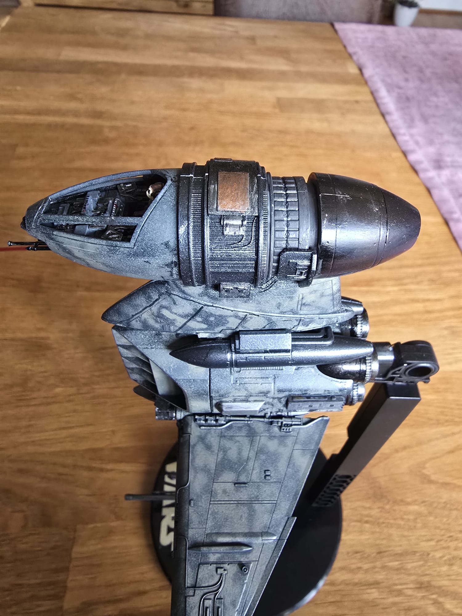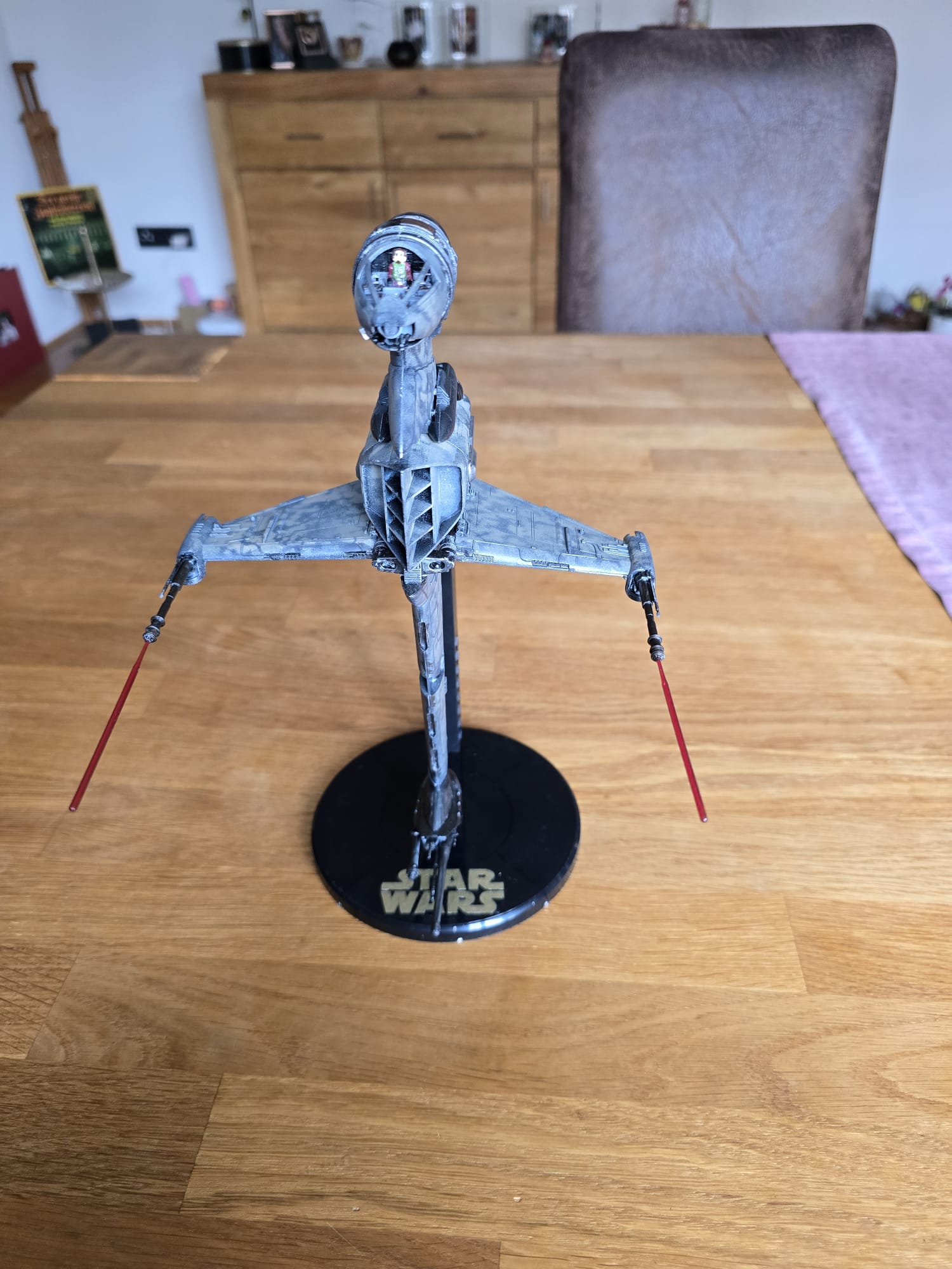 Der BWing Fighter ist fertig. Der Ständer war in klarem Kunststoff und ich habe ihn von hinten in schwarz lackiert und den Starwars Schriftzug habe ich mit dem Pinsel gemalt. Flächen wurden mit Airbrush und die die akleinteile mit dem Pinsel gemacht.