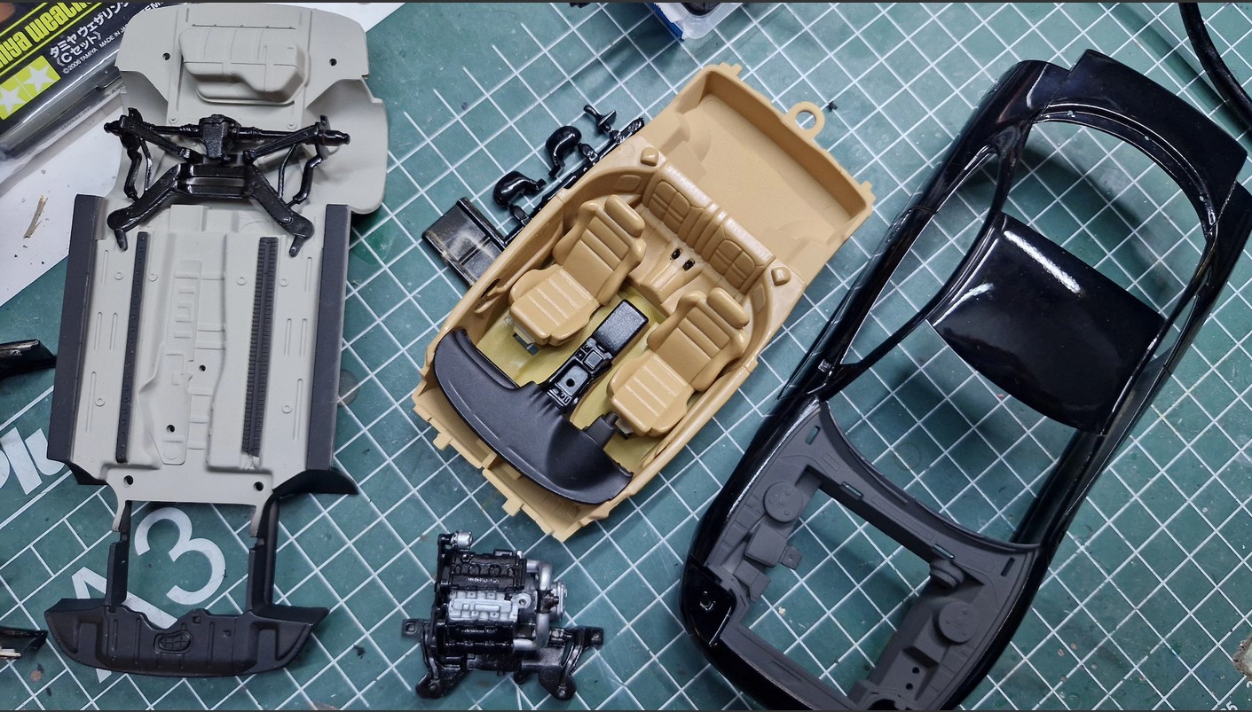 Stand Corvette C8: die Innenausstattung ist fertig gestellt. Alle Decals am Fahrgestell, Motor und Innenausstattung sind angebracht.