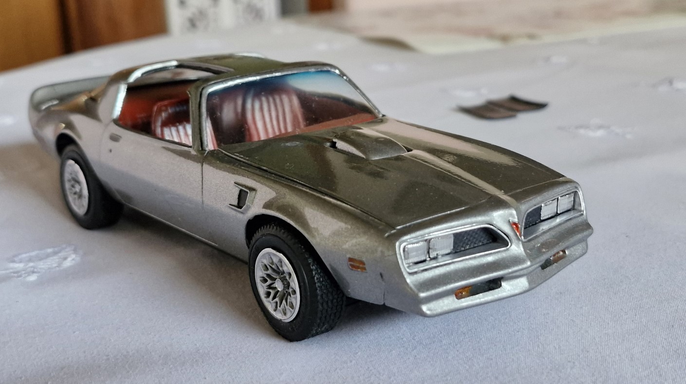 Weiter habe ich mit meinem Enkel (6) einen 1977 Trans Am restauriert. Bekommen habe ich den von meinem Bruder aus einem Beifang. Er war mit dem Pinsel bemalt. Mit Dowanol entlackt, abgebrochene Teile an der Karosserie ergänzt, gespachtelt und verschliffen, konnte ich an die Lackierung gehen. Von Anfang an, hat mich mein Enkel während der Osterferien begleitet. Die Farben innen wie außen hat er so ausgesucht. Exzelent :D Mit der Airbrush lackieren hat er auch seine ersten Versuche erfolgreich hinter sich gebracht. Nein, nicht am Modell. Ich habe ihn nach getaner Arbeit an einem Opfer und Plastiklöffel üben lassen. Aber er hat schon das Händchen dafür. Wenn er weiter Interesse daran hat, fördere ich das natürlich umso mehr.