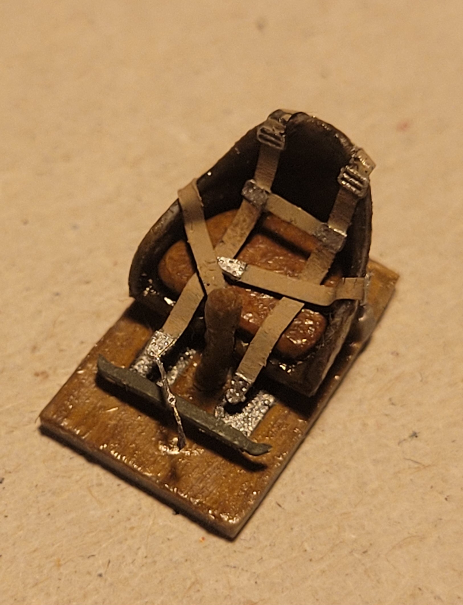 Des Weiteren gab es Holzoptik für den Boden vom Cockpit (beige grundiert, Ölfarbe gebrannte Umbra drauf, clear Orange hinterher...der Klassiker also), Trittbleche in Alu, Gestänge in Oliv.