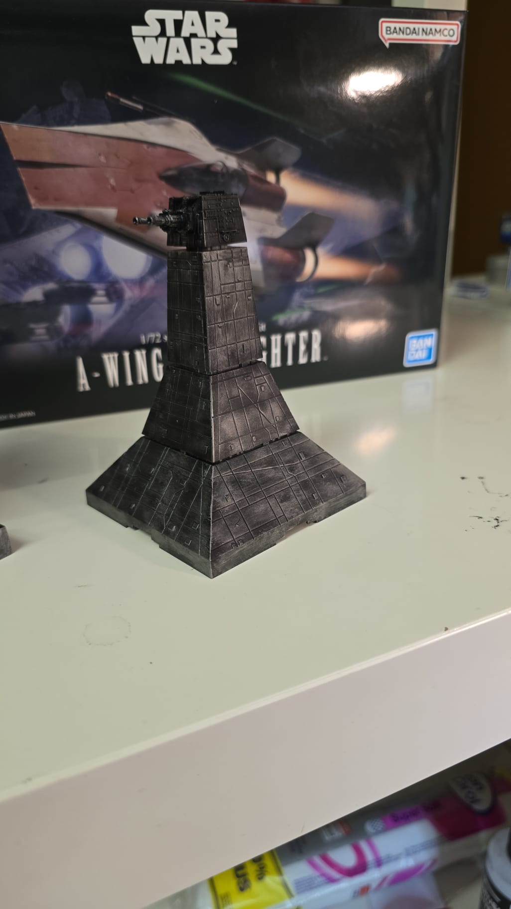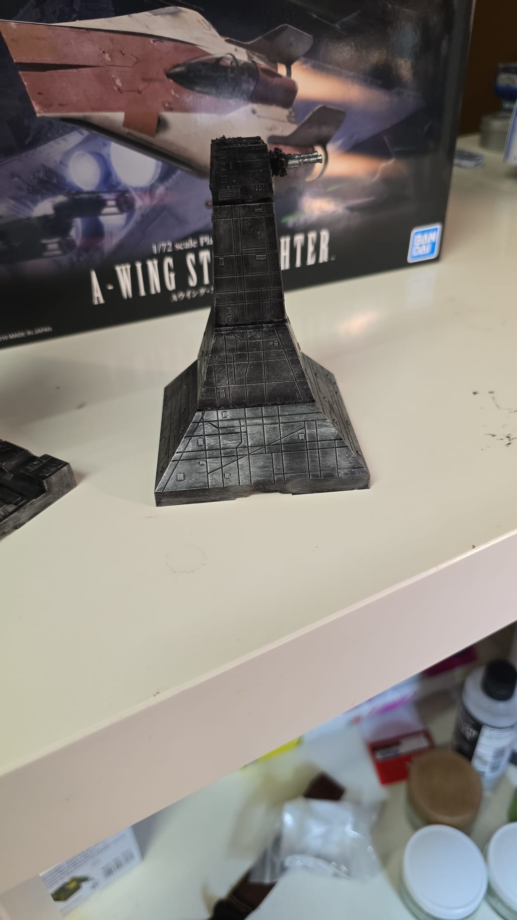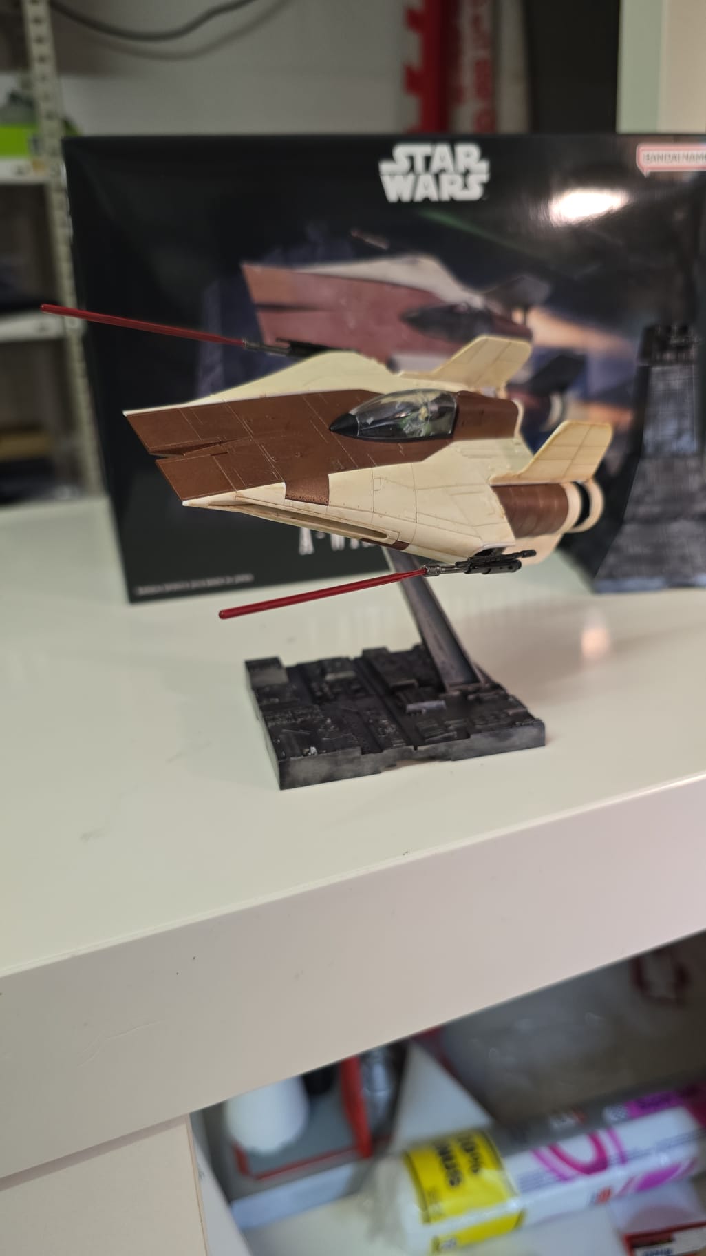 Nach dem B- und X-wing Fighter habe ich zur Beruhigung den A-Wing Starfighter von Bandai gebaut. Das "Braun" ist eine Mischung aus Vallejo Rust und Tamiya Rotbraun. Das Rust war zu glänzend....