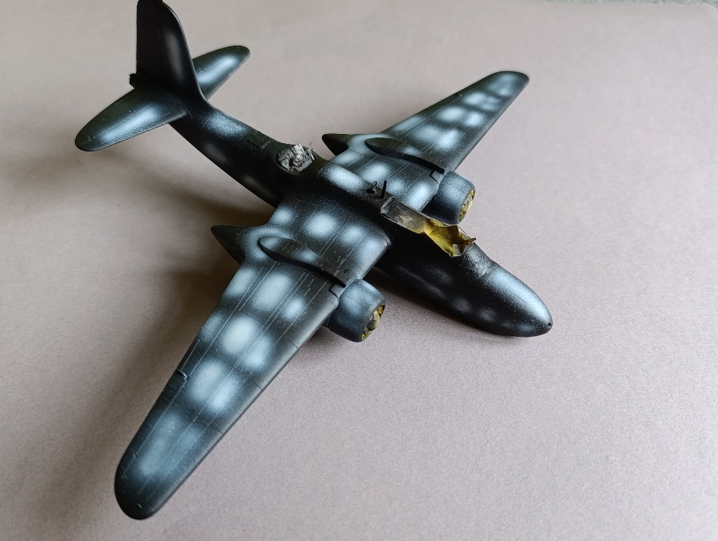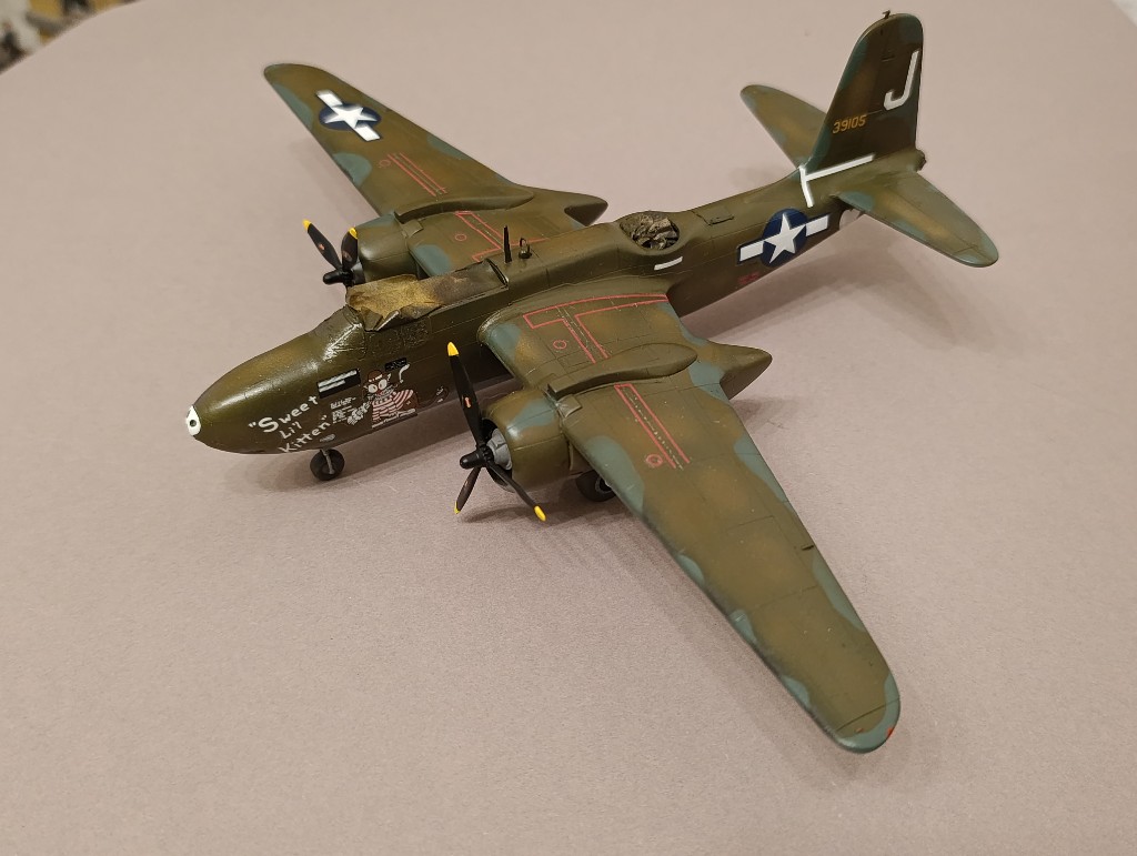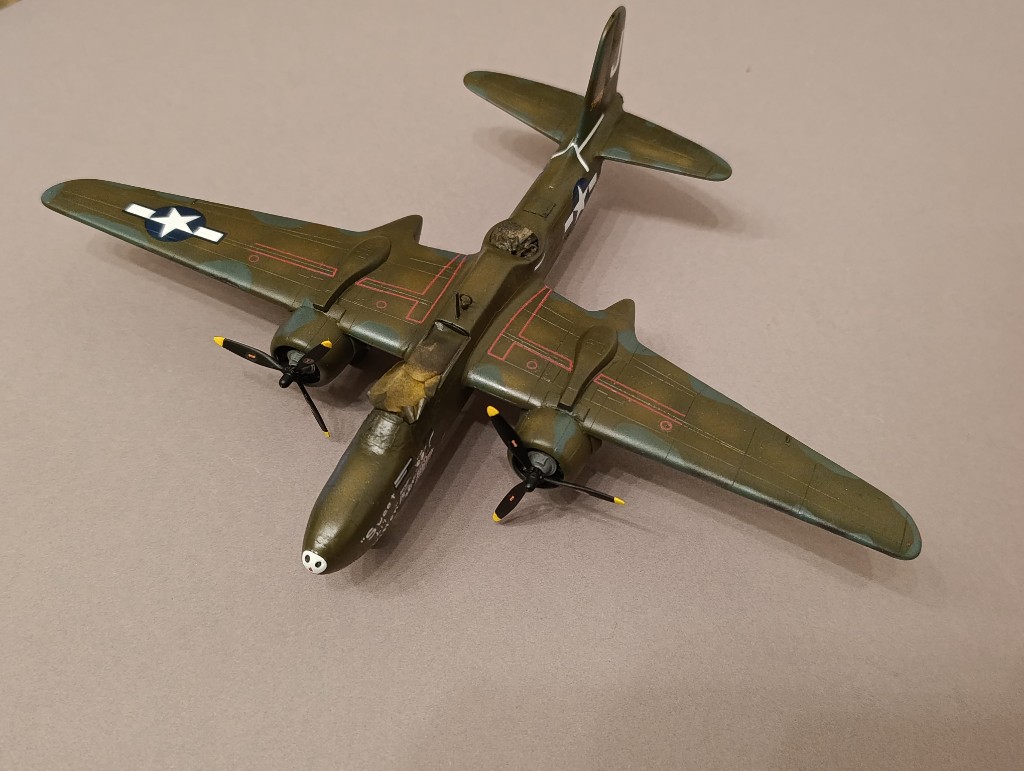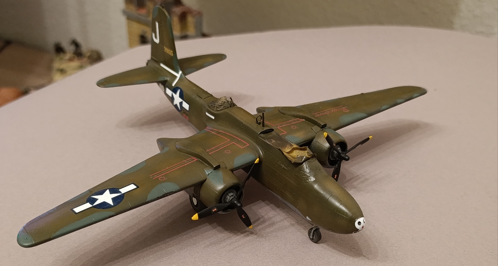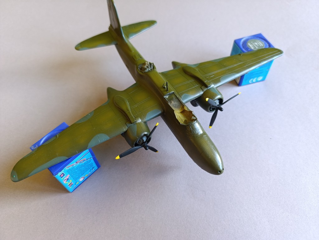 Die A-20 geht auch langsam voran. Danke genügend Spachtelmasse konnte ich den Buckel an der Nase Augenscheinlich beheben. Auch die in Mitleidenschaft gezogen Gravuren habe ich nochmal graviert.