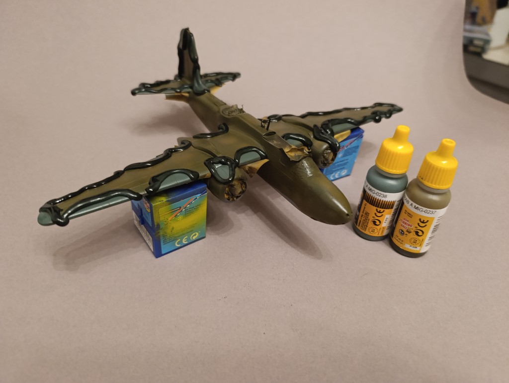 Mit mittelgrün wurden die Tarnflecken aufgetragen. Das wirkte zunächst etwas gewöhnungsbedürftig, weil die Flecken alle entlang des Randes verteilt sind