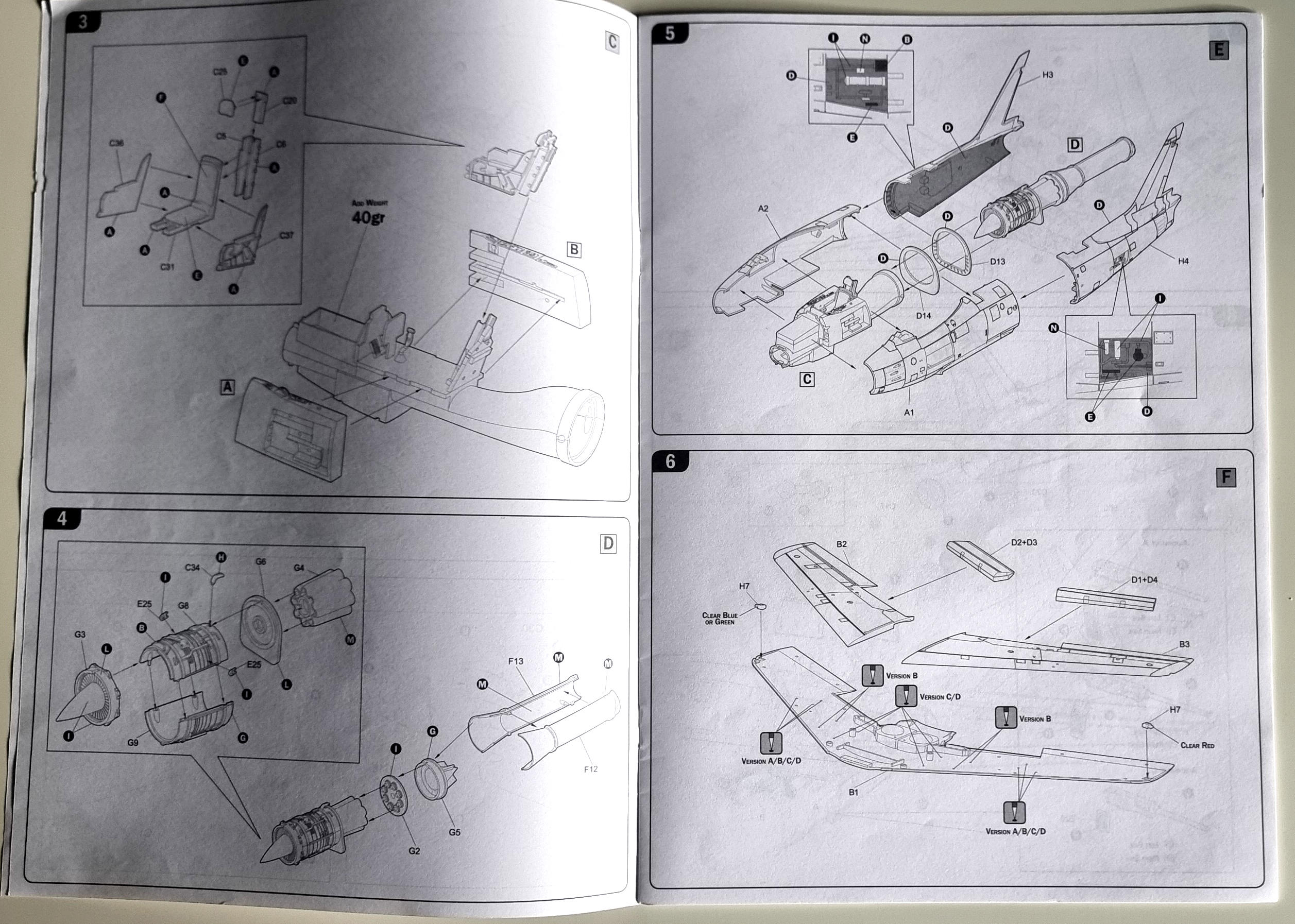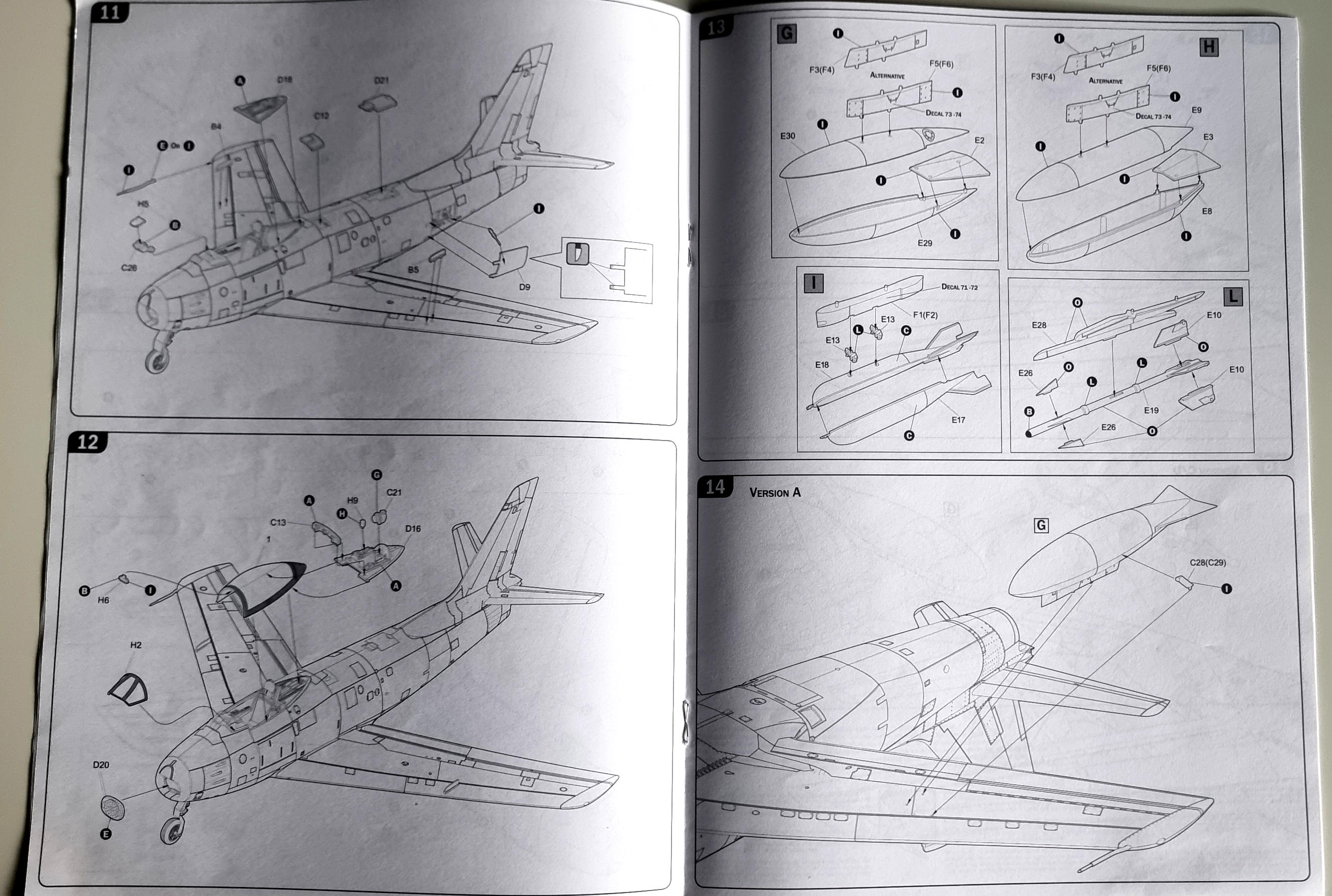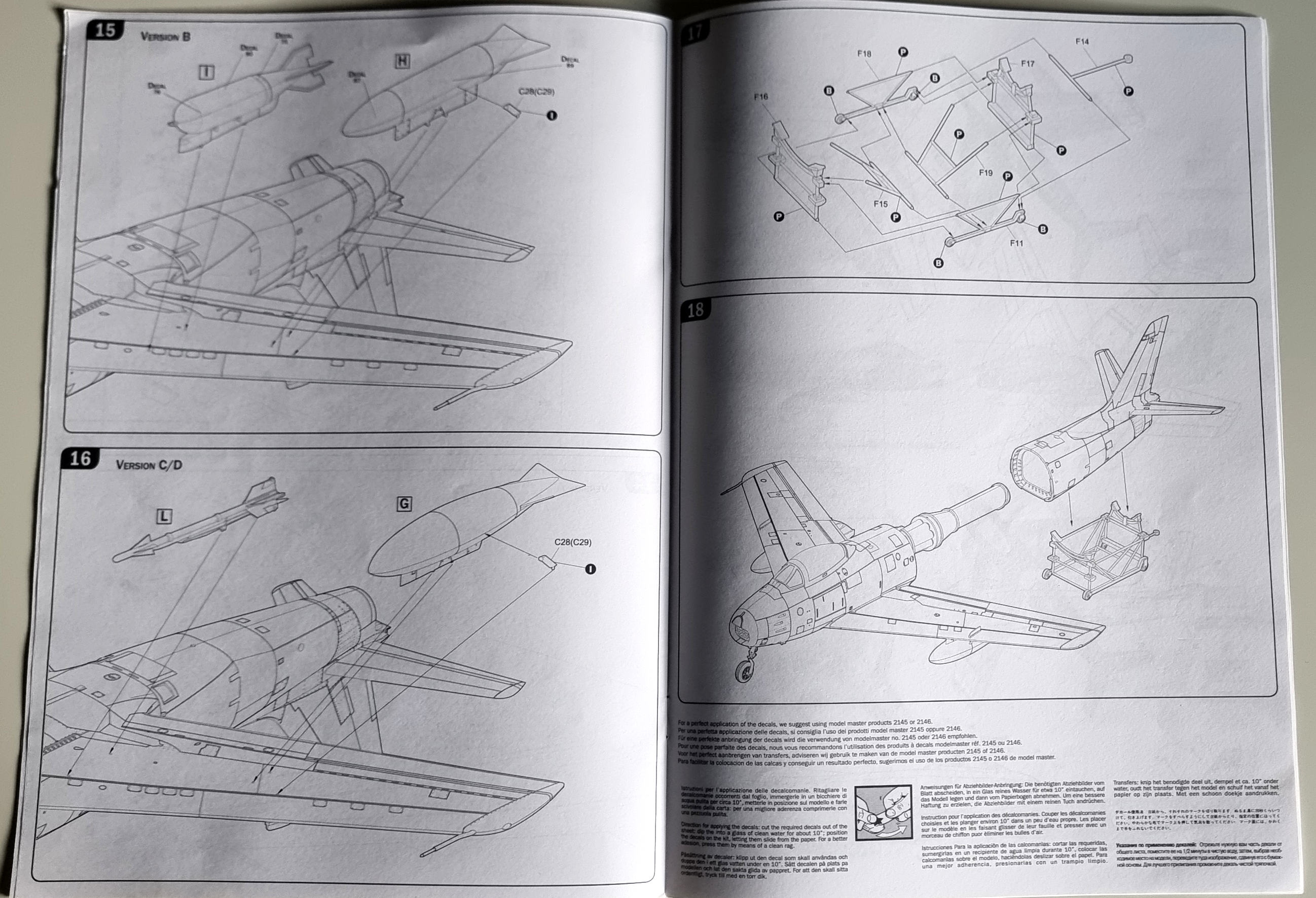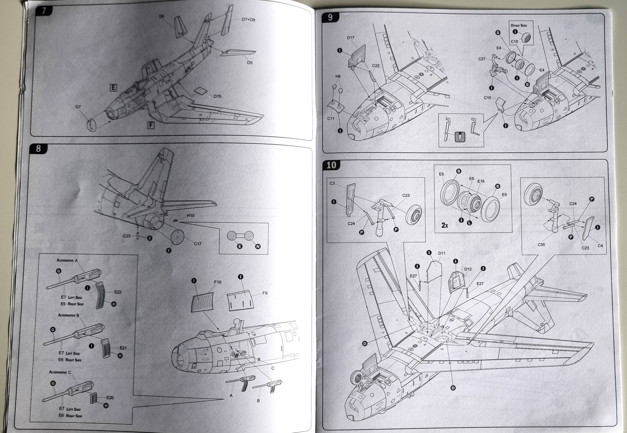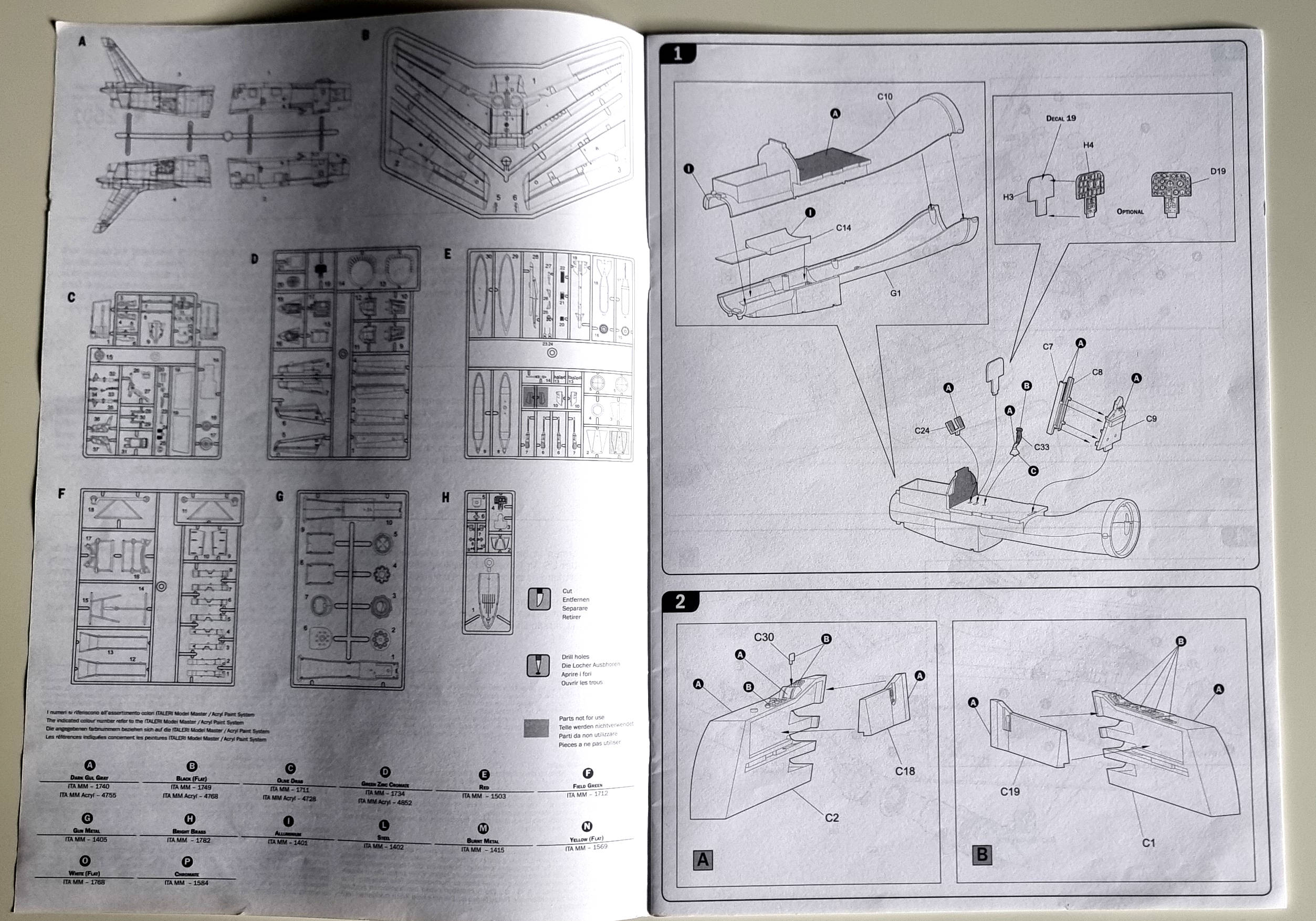 Die von Italeri beigelegte Bauanleitung ist sehr übersichtlich und erklärt den Zusammenbau des Flugzeugs in insgesamt 18 gut nachvollziehbaren Bauabschnitten (2 je Seite). Zusätzlich werden die einzelnen Gießäste am Anfang der Anleitung dargestellt, so dass man die einzelnen Teile gut finden kann.