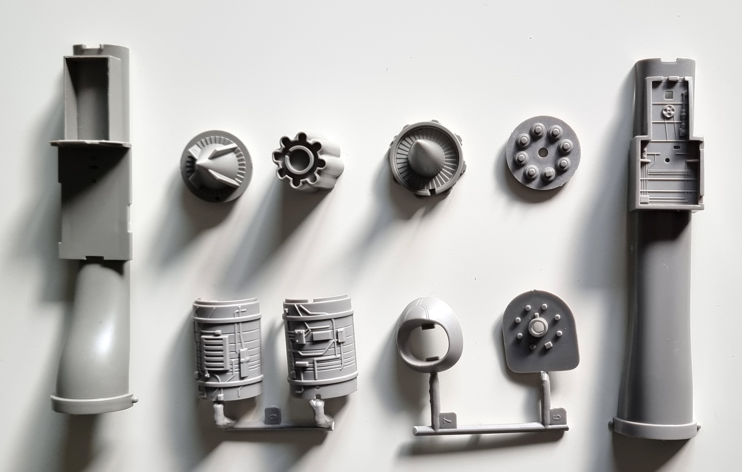 Auf einigen Bauteilen des Triebwerks befinden sich leider einige Auswerfermarken, die man ggf. entfernen muss.
