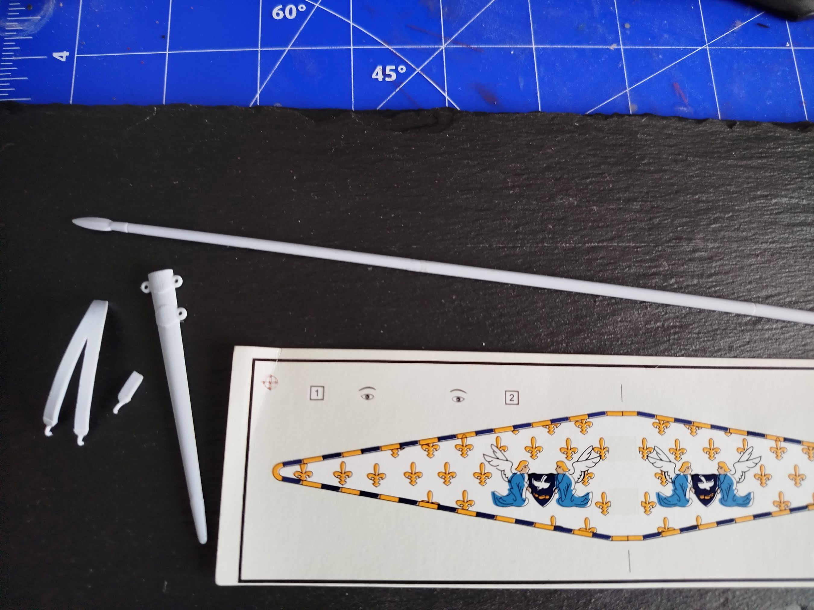 Im Abschnitt 8 ist der Schwerthalfter mit den Gürten, im Teil 9 die Stange mit Wimpel zu bauen.