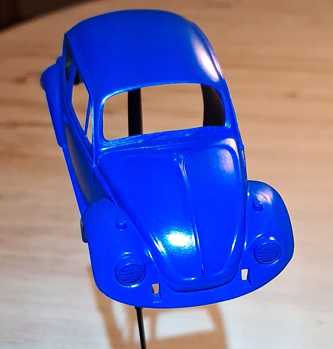 Dann wollte er selbst mal einen "besseren" Bausatz bauen. Also keinen snapkit. Er suchte sich im Regal a) den Lamborghini Countach 5000 von Italeri und b) den wunderbaren 1966 Käfer von Tamiya. Den Lamborghini (ich kann seine Wahl absolut nachvollziehen) hat er begonnen aber doch schnell gemerkt, dass die Hürde noch zu hoch ist. Also liegt der fertig lackiert und bemalt, wartend auf die Komplettierung wieder im Karton. Ich hatte Lackabplatzer beim Endspurt und weiß noch nicht, wie es mit dem weiter geht. Möchte den erst mal nicht sehen. Nächstes Jahr dann.