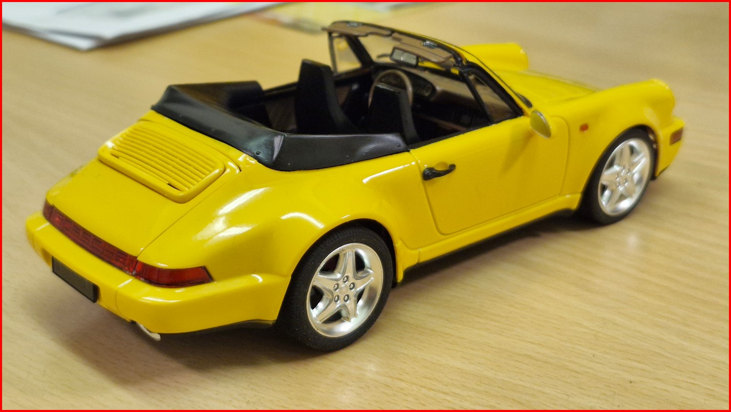 Auf ein gelbes Auto hatte ich auch mal wieder Lust und so schnappte ich mir eine Baustelle, die ich günstig bei diesem Onlineauktionshaus ergattern konnte (neben 2 weiteren 964 Cabrios im Turbolook). Bereits begonnen war die Karosserie, in dem alle Bauteile schon verklebt waren und auch nicht komplett. So ist die Motorhaube verschlossen, da speziell hier Teile fehlen. Die Felgen stammen vom Ferrari 512TR