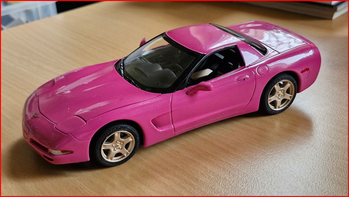 Die Basis lackierte ich in pink und hustete in mehreren Durchgängen einen metallicfarbenen Nagellack drüber. Das Metallic ist superfein. Ohne Klarlack wirkte die Corvette wie eine Perle. Aber Klarlack muss immer druf. Innen mit goldfarbeben Akzenten und die Felgen wie gewünscht ebenso in gold. Letzten Monat fertig, nächste Woche wird sie übergeben.