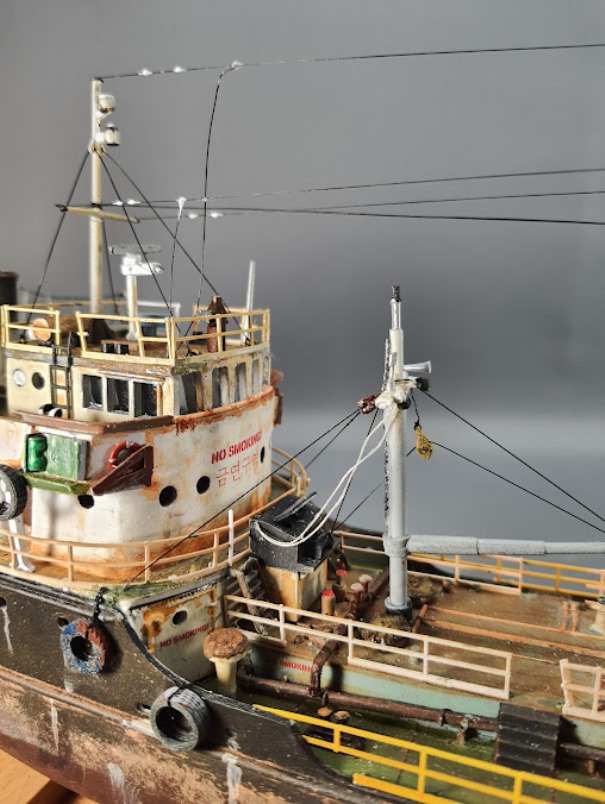 Auf meinem Vorlagenbild sind diese, merkwürdig hoch angebrachten, Reifen auch zu sehen. Das habe ich zwar noch nie gesehen schein aber, bei solchen kleinen Tankern nicht unüblich zu sein, wenn Ladung von Großschiffen, auf hoher See übernommen wird.
