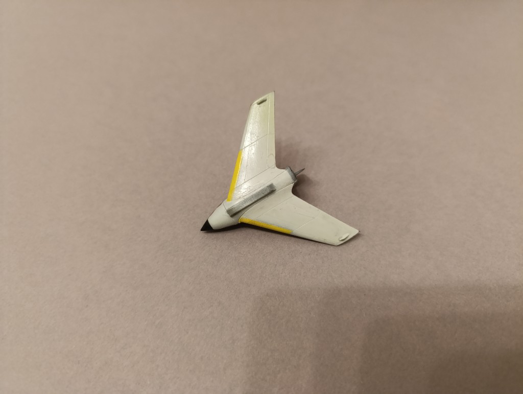 Nun hieß es Fleißarbeit, was das abkleben betrifft, denn die gelben Flügelkanten, die silberne Landekuve und das Triebwerk sollten lackiert werden.