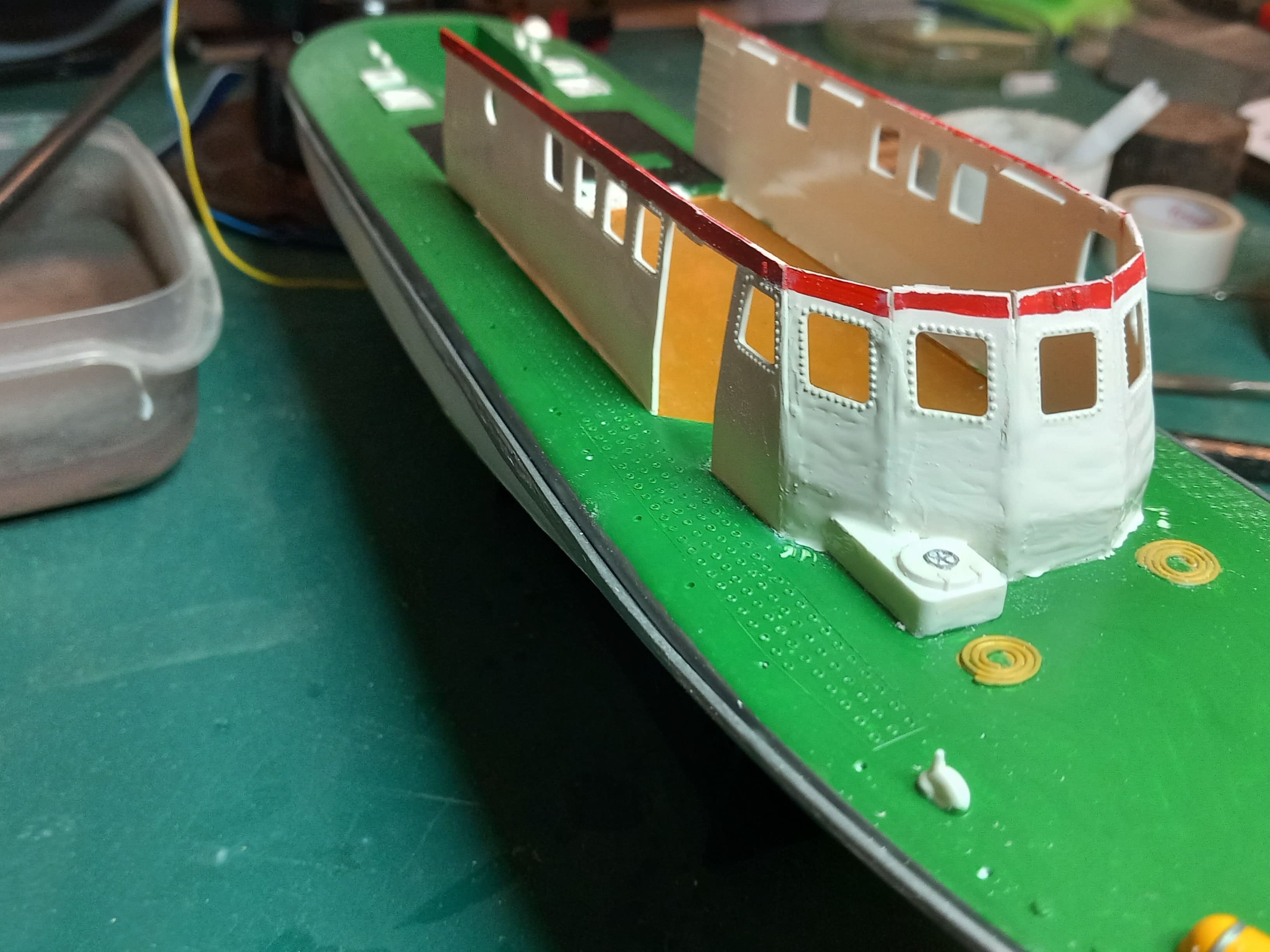 Die Fensterelemente habe ich weiter verschliffen. Das sieht jetzt soweit ganz gut aus. Die Fensterscheiben wurden eingesetzt und die Fenster mit Scheibenwischern ausgestattet. Die Vorderfenster haben runde Kreise bekommen. Welche Funktion haben diese Kreise? Weiße Farbe wurde aufgetragen. Das gefällt mir so noch nicht. Die werde ich nochmal ablösen und neu auftragen. Ist halt immer problematisch mit weiß und rot. Gruß Ingo