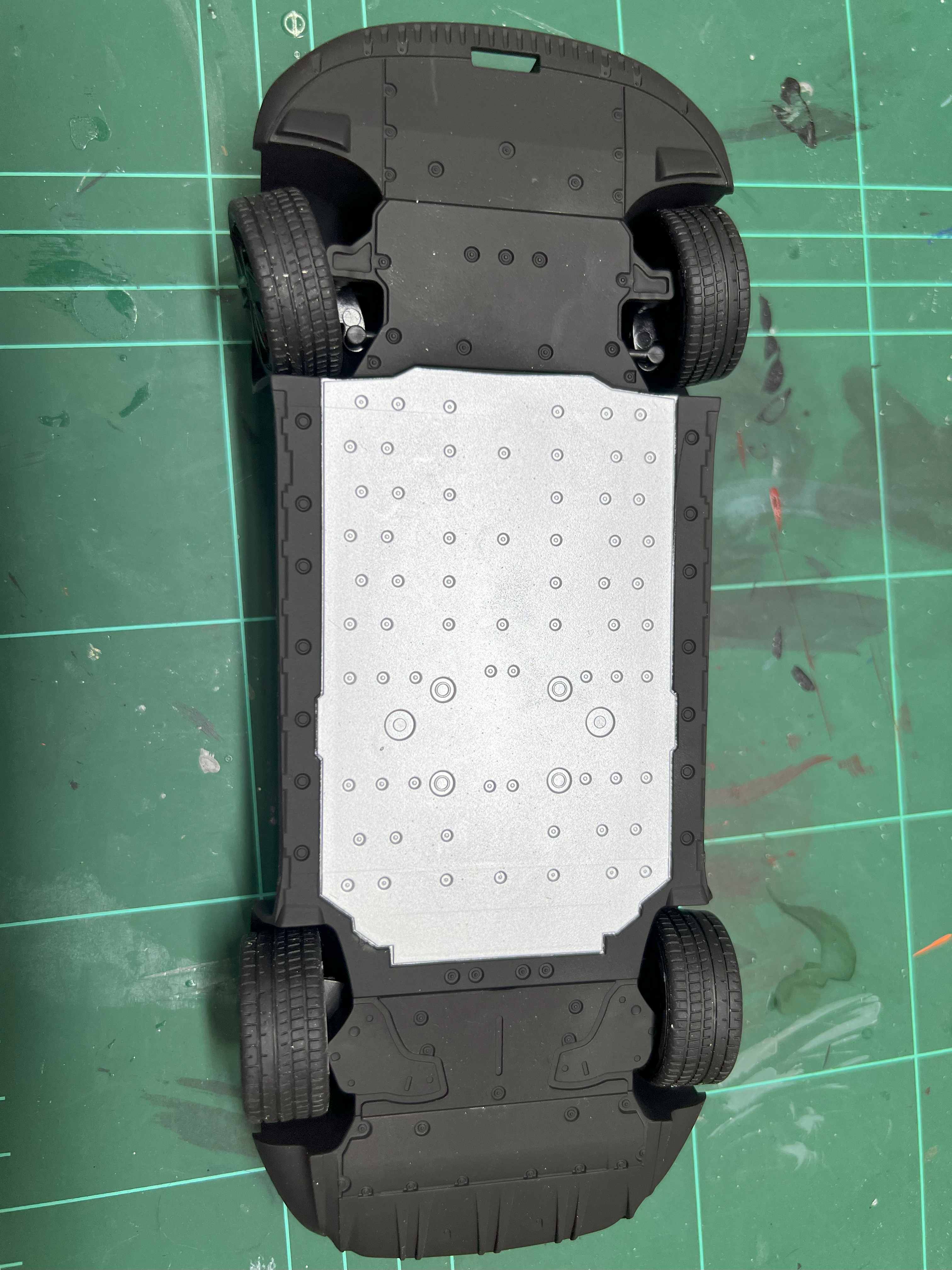 Der Unterboden war auch mit dabei. Die Bauanleitung sagt, dass man die große Fläche in Alu 99 bemalen soll. Ich habe den kompletten Unterboden in Schwarz matt 08 gebrusht und anschließen die große Fläche (wird in der Realität das Akku-Modul sein) in Alu, aber da habe ich das Alu von Vallejo genommen, das geht besser durch die Airbrush.