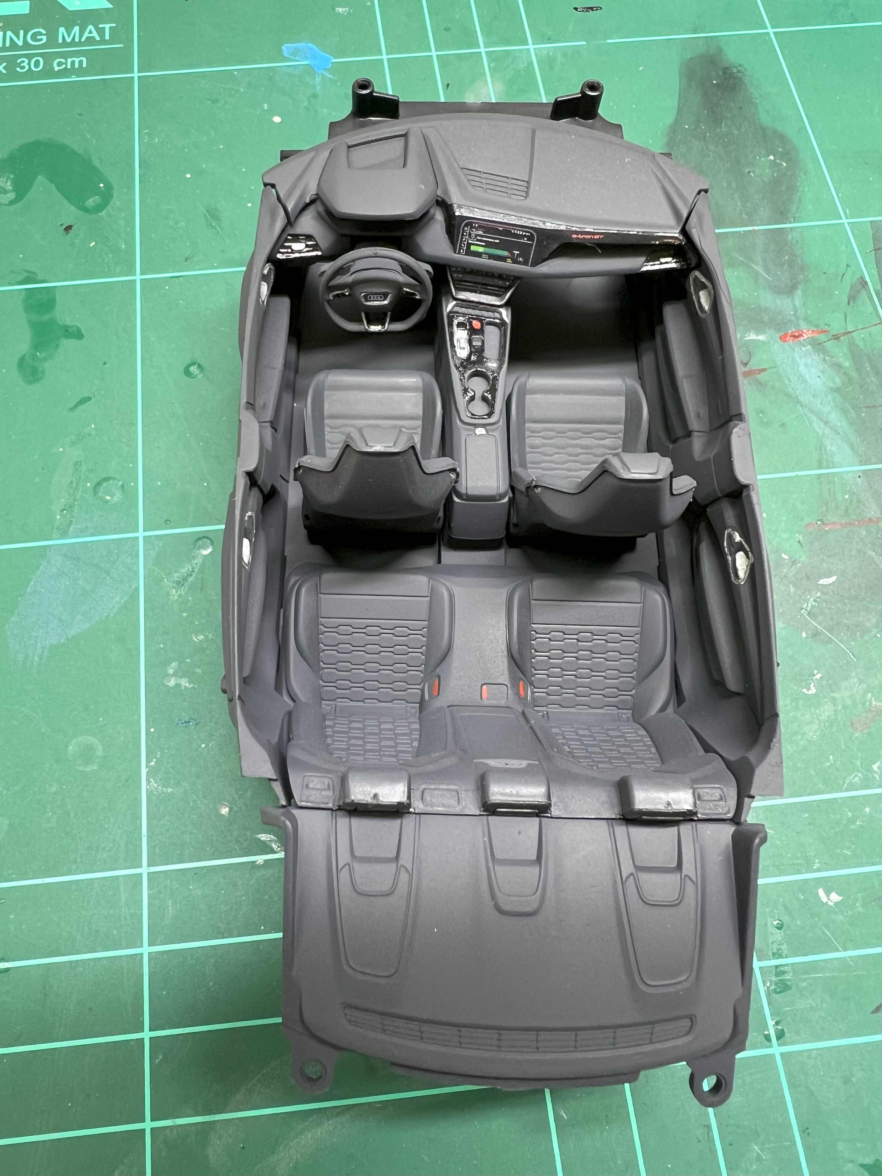Der Innenraum ist meiner Meinung nach sehr gut detailliert und es lässt sich eine Menge mit Farbe hervorheben. Man kann sicherlich noch mehr machen, wie zu Beispiel Gurte und Anschnaller auf den Vordersitzen, aber das sieht man nachher am fertigen Modell sowie so nicht gut.