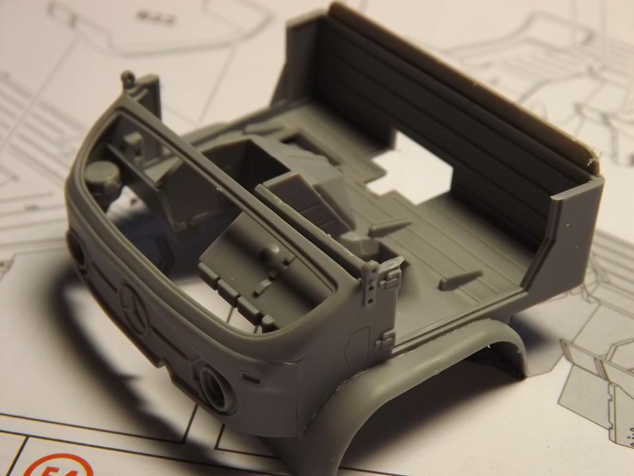 Den Aufbau legte ich jetzt schon einmal auf den Rahmen auf. Macht alles einen passablen Eindruck. Unter dem Boden des Kastens klebte ich noch diverse Zurüstteile wie Staukisten, Kanisterhalter und Aufstieghilfen sowie den Halter für das Ersatzrad.