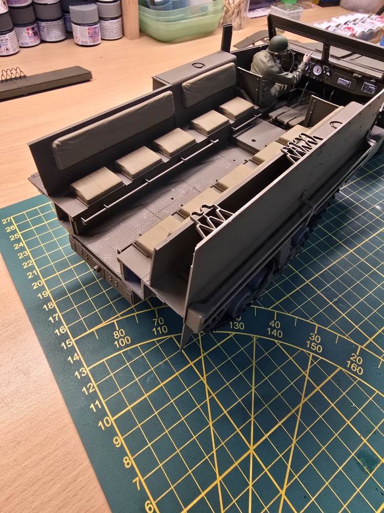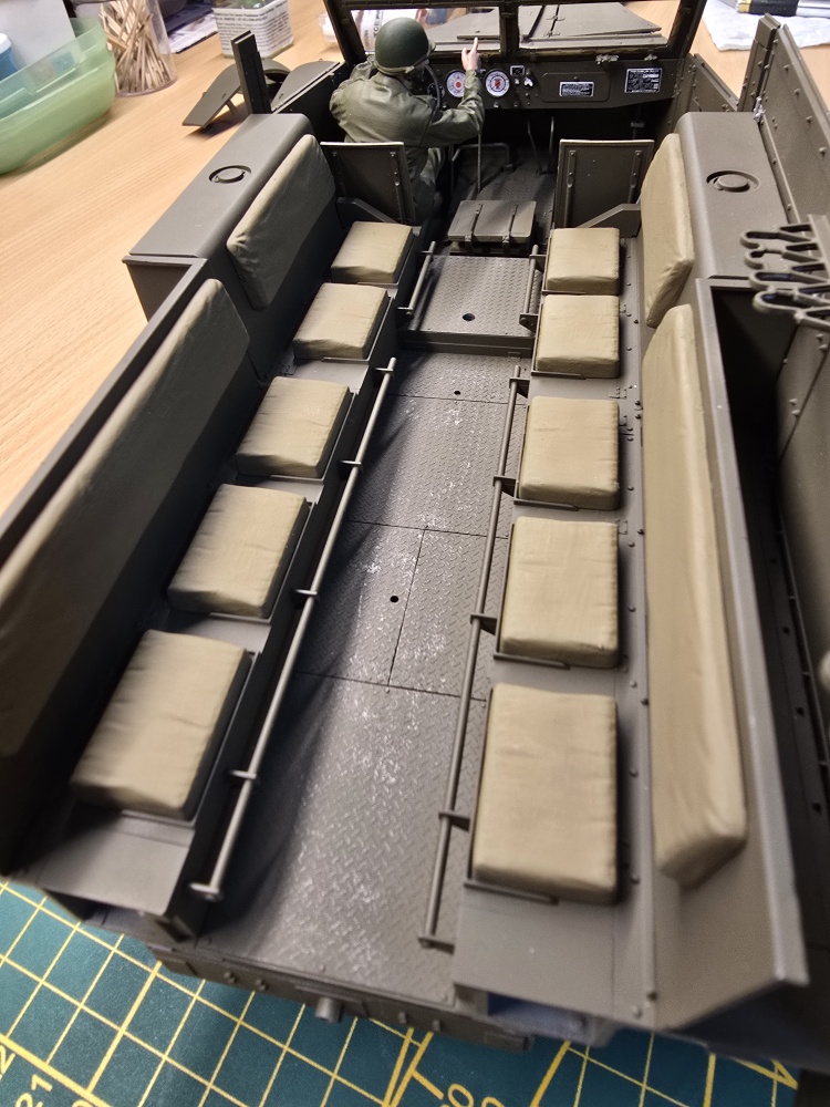 Laut Bauplan muss in die Fahrerkabine auch der Fahrer relativ zu Anfang mit eingebaut werden . Dieser liegt dem Bausatz auch bei . Leider aber nur eine Figur .2 bis 3 wären viel schöner gewesen. Auch hab ich noch nicht wirklich US Soldaten in 1/16 gefunden .