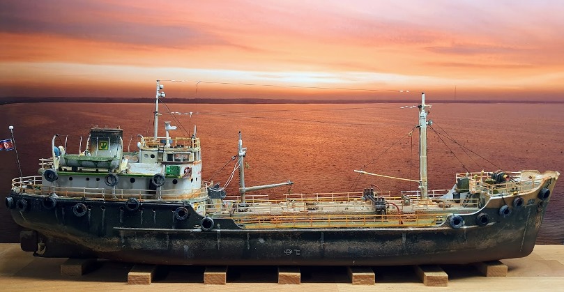Auf meinem Vorlagenbild sind diese, merkwürdig hoch angebrachten, Reifen auch zu sehen. Das habe ich zwar noch nie gesehen schein aber, bei solchen kleinen Tankern nicht unüblich zu sein, wenn Ladung von Großschiffen, auf hoher See übernommen wird.