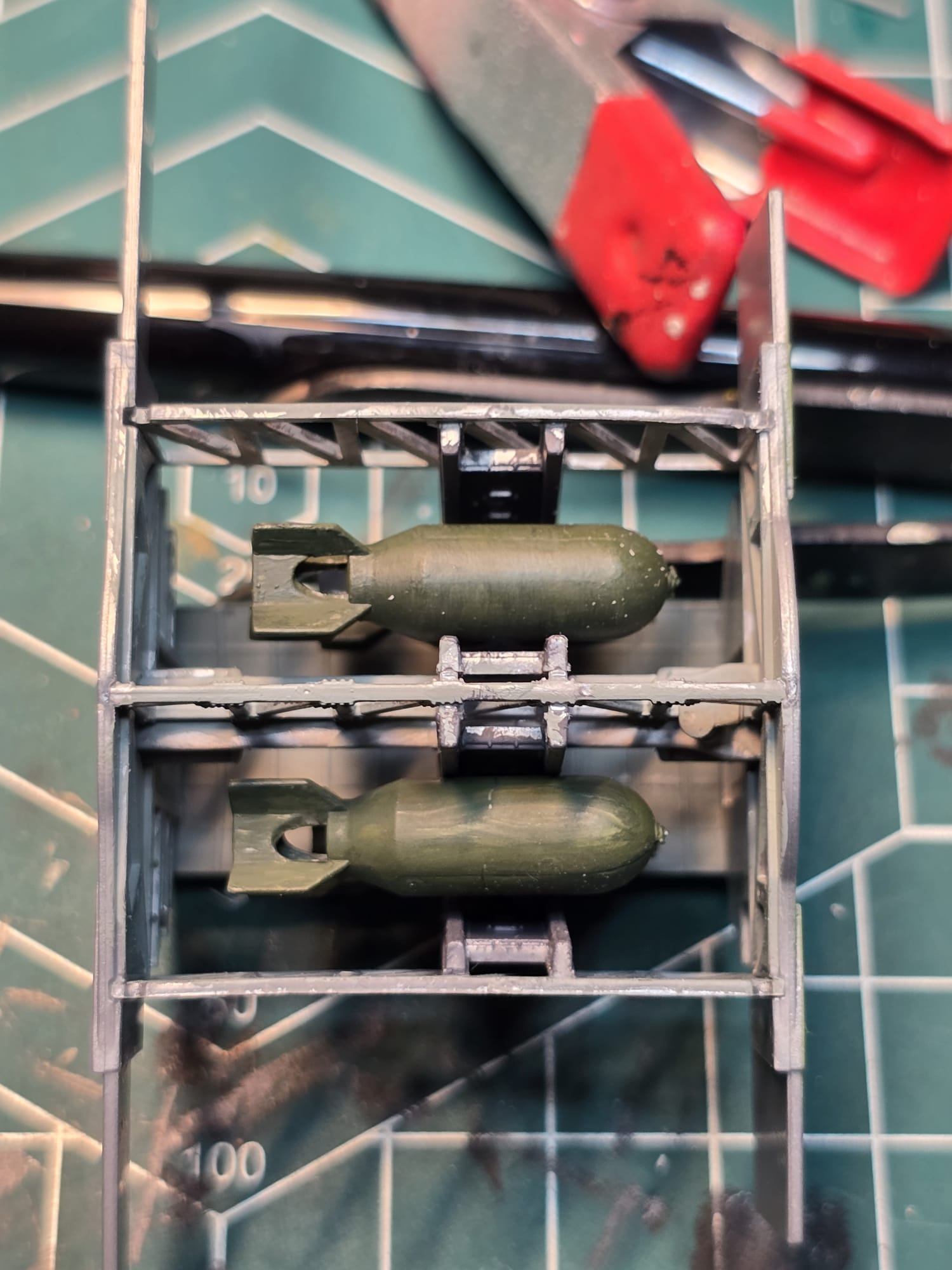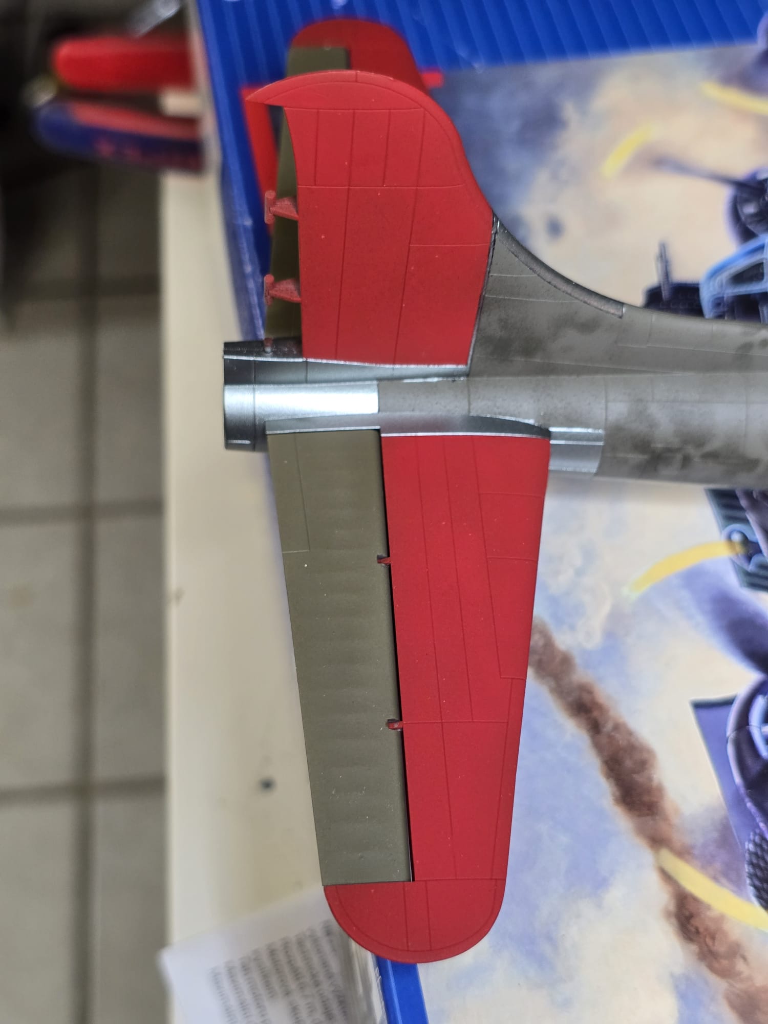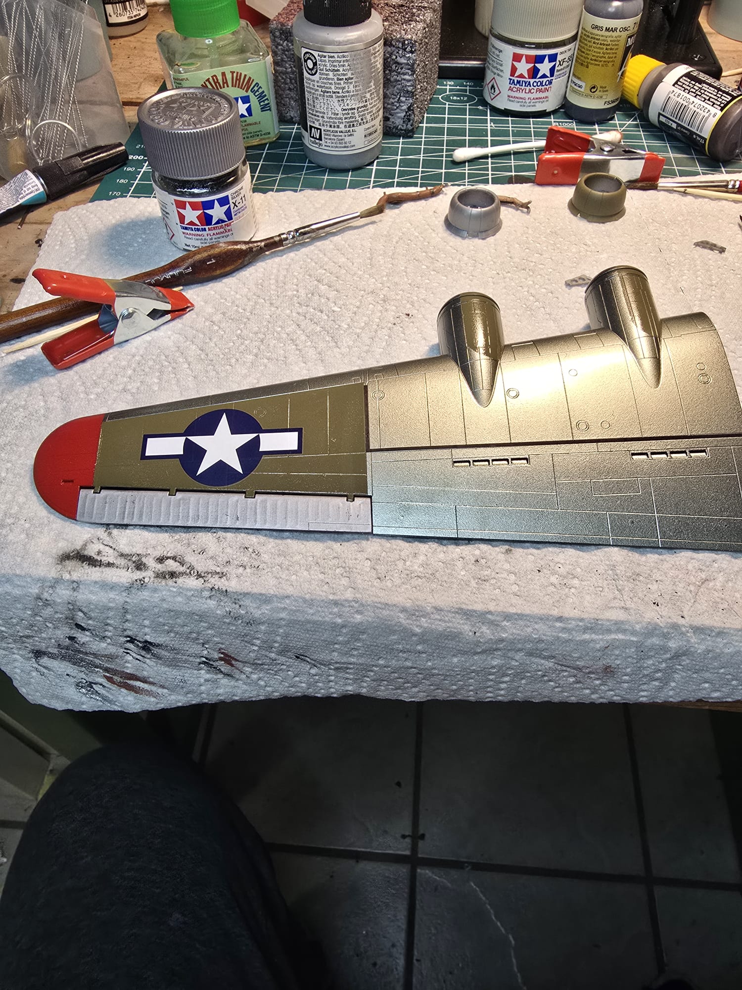Auf den Bildern sind die Flügel fertig lackiert und mit Decals versehen. Der Rumpf und Heck braucht noch Klarlack. Die Hauptfarbe ist Kaleido Tungsten Steel und der Klarlack ist ebenfalls von Kaleido. Der Rest ist Tamiya und Vallejo.