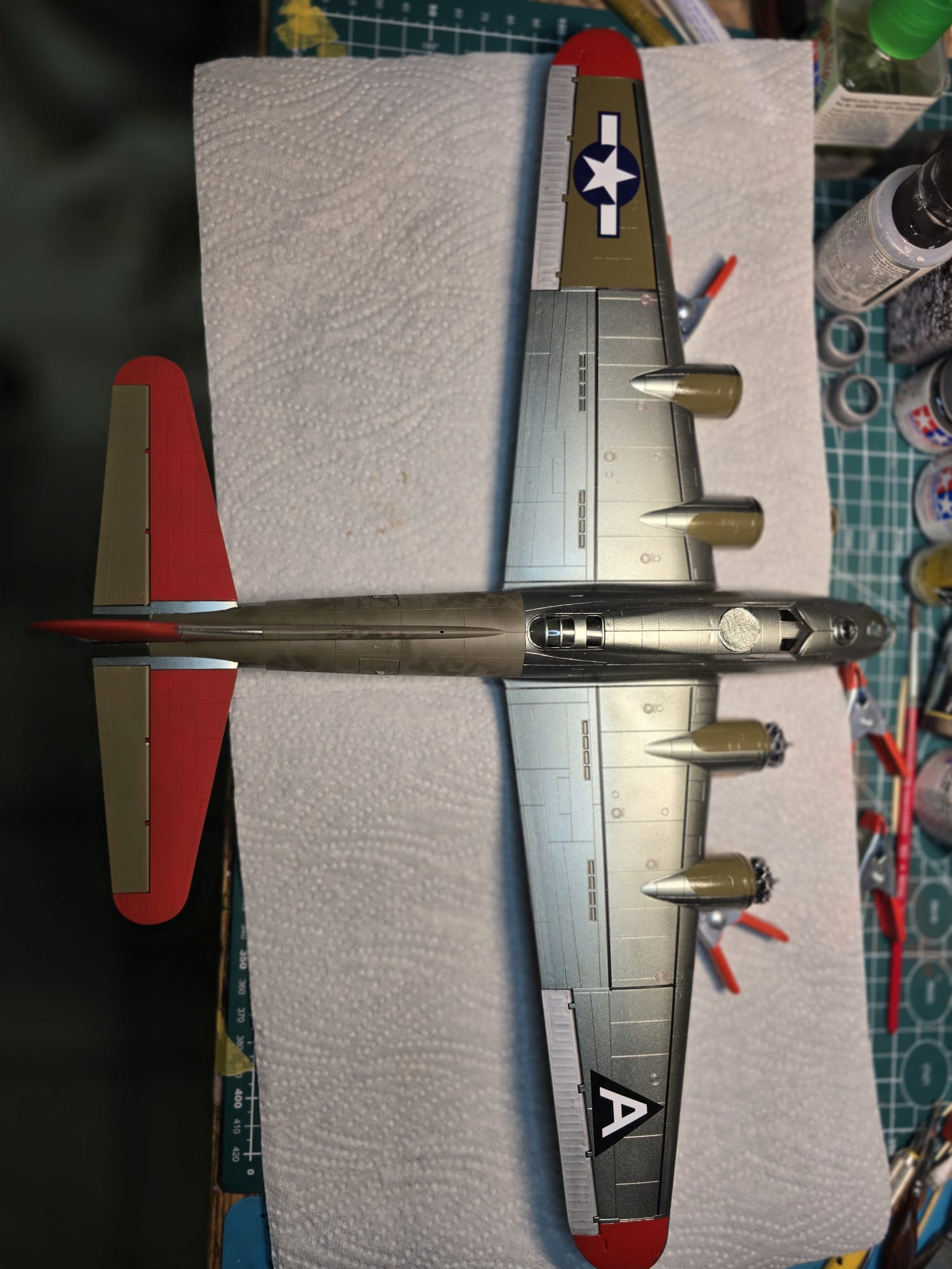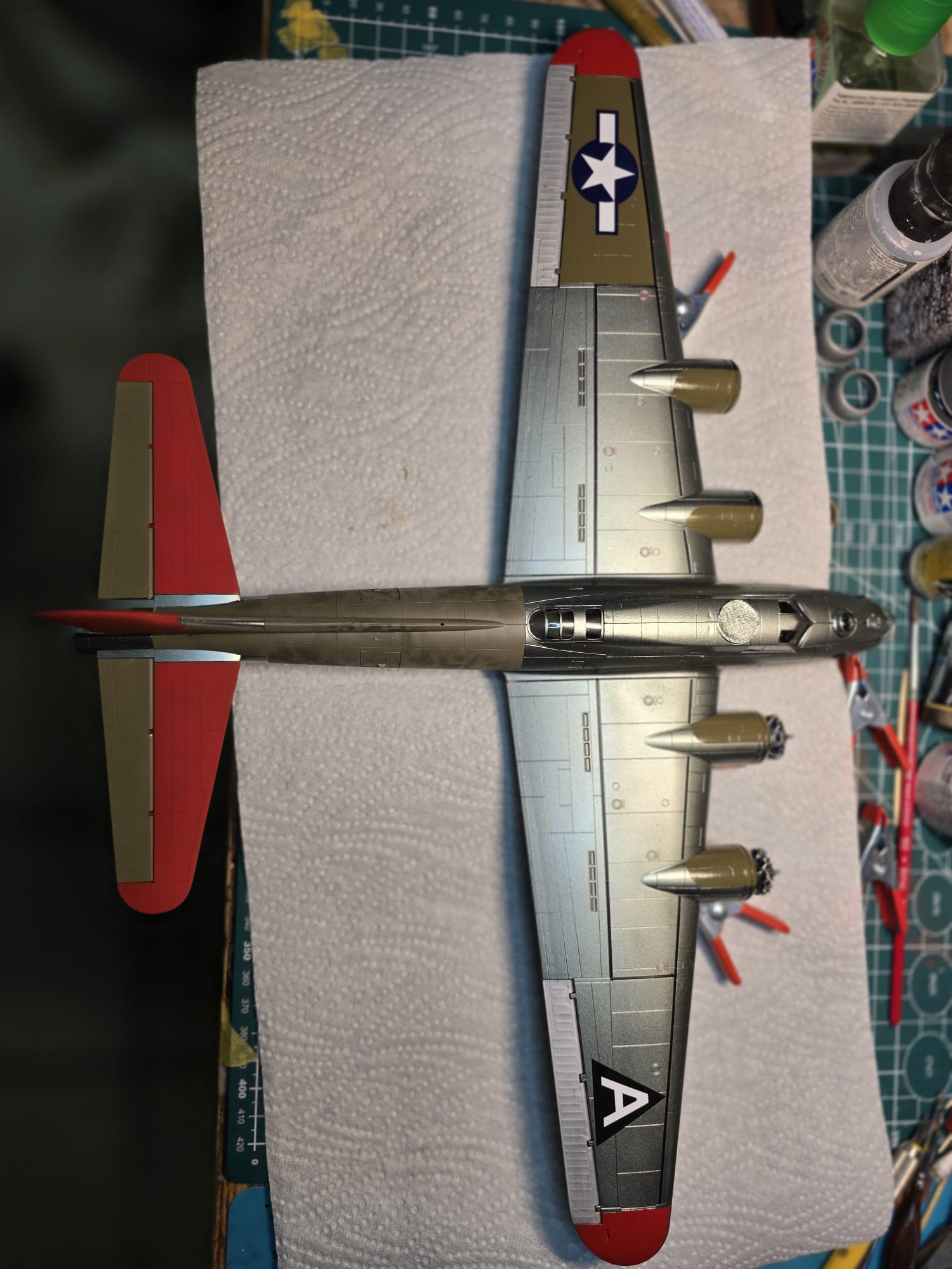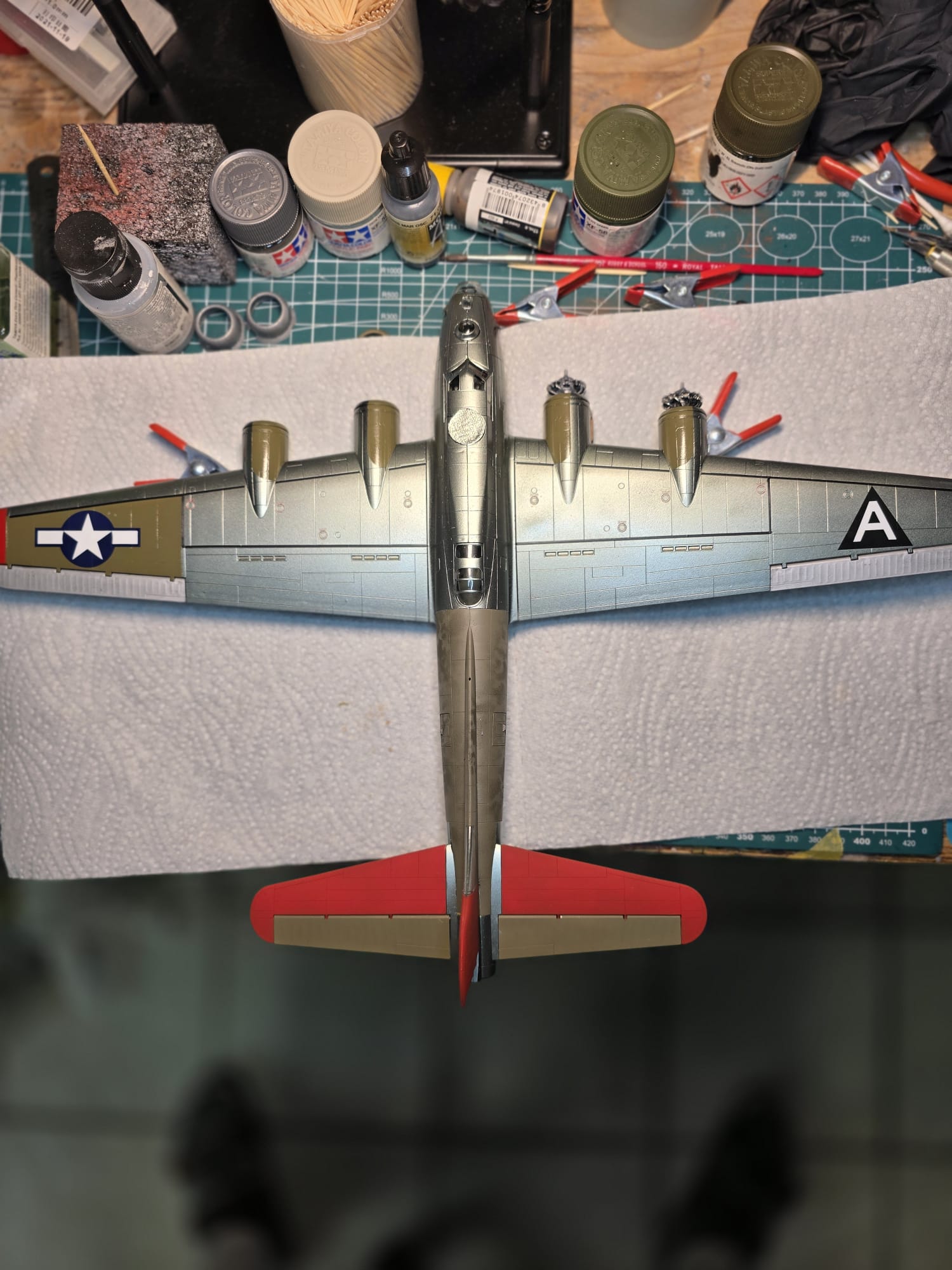 Auf den Bildern sind die Flügel fertig lackiert und mit Decals versehen. Der Rumpf und Heck braucht noch Klarlack. Die Hauptfarbe ist Kaleido Tungsten Steel und der Klarlack ist ebenfalls von Kaleido. Der Rest ist Tamiya und Vallejo.