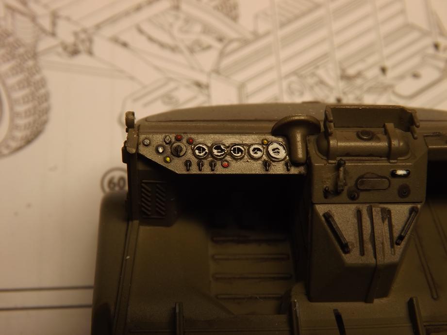 in den letzten Tagen ging´s nur langsam weiter. Ich habe ein Washing mit schwarzer Ölfarbe aufgelegt, die Armaturen bemalt und auf die Decals der Zifferblätter Glanzlack gepinselt - der Klarlack ist noch nicht trocken, weshalb er noch milchig wirkt: