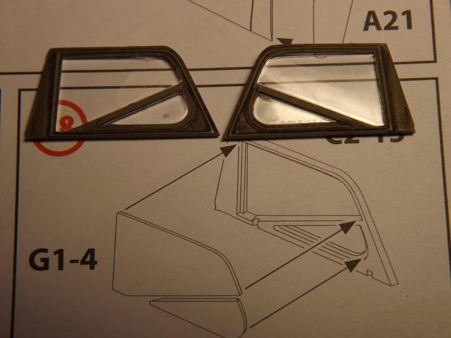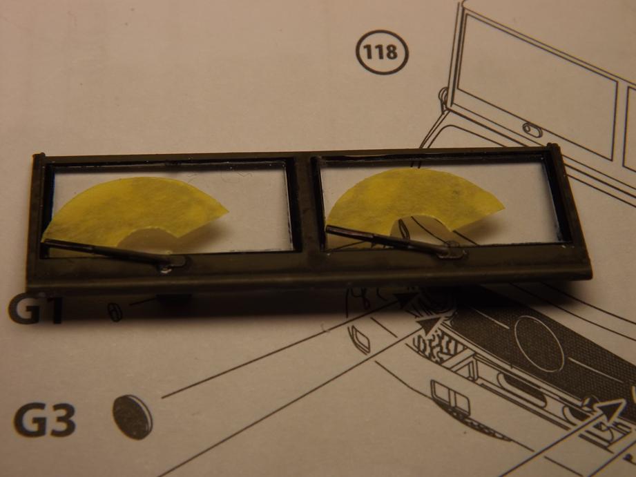 Der Rahmen der Frontscheibe ist lackiert - er steht überigens Kopf. Die Befestigungspunkte für die Wischer liegen an sich unten. Die Scheiben habe ich vor dem Einkleben mit einem wasserfesten schwarzen Filzstift umrandet, um so Fenstergummis anzudeuten. Eingeklebt sind sie mit Revell Contacta Clear. Es war vor längerer Zeit eine gute Idee, mir das zuzulegen. Zuvor war es meist so, dass Klarsichtteile mit dem normalen Kleber verhunzt wurden; Scheinwerfergläser wurden von innen trüb. Jetzt muss ich zwar etwas länger warten, bis der Kleber trocken ist, das Ergebnis ist aber deutlich besser. Ein schwarzes Washing auf dem Rahmen ist aufgebracht und die Scheibenwischer sind abgeklebt. Den Wischerbereich habe ich mit Maskierband abgeklebt. Wenn die Airbrush mal wieder in Betrieb ist, werde ich das freiliegende Glas etwas "einstauben" und "verschmutzen", der gewischte Bereich bleibt klar.