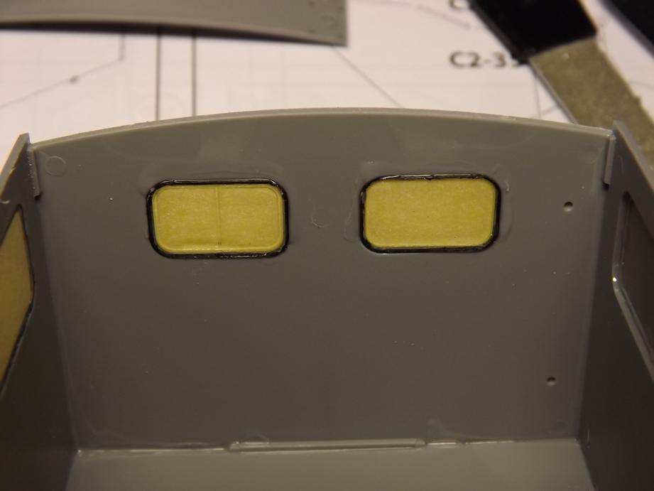 An den Seitenwänden klebte ich je einen Klappladen auf, in das jeweils andere Fenster, sowie in die Öffnungen vorne und hinten klebte ich Klarteile ein. Diese erhielten, wie schon bei der Frontscheibe beschrieben einen angedeuteten "Dichtungsgummi" aus schwarzem Filzstift. Vor dem Einkleben der Klarteile maskierte ich diese mit Masking-Tape. Dieses klebte ich auf und schnitt das, was überstand mit einem Skalpell am Rand ab. So kann ich die Scheiben vor dem Lackieren einfügen und sie bleiben schön sauber.