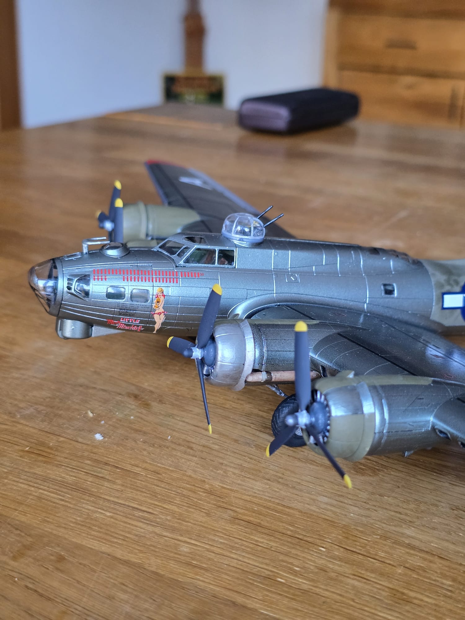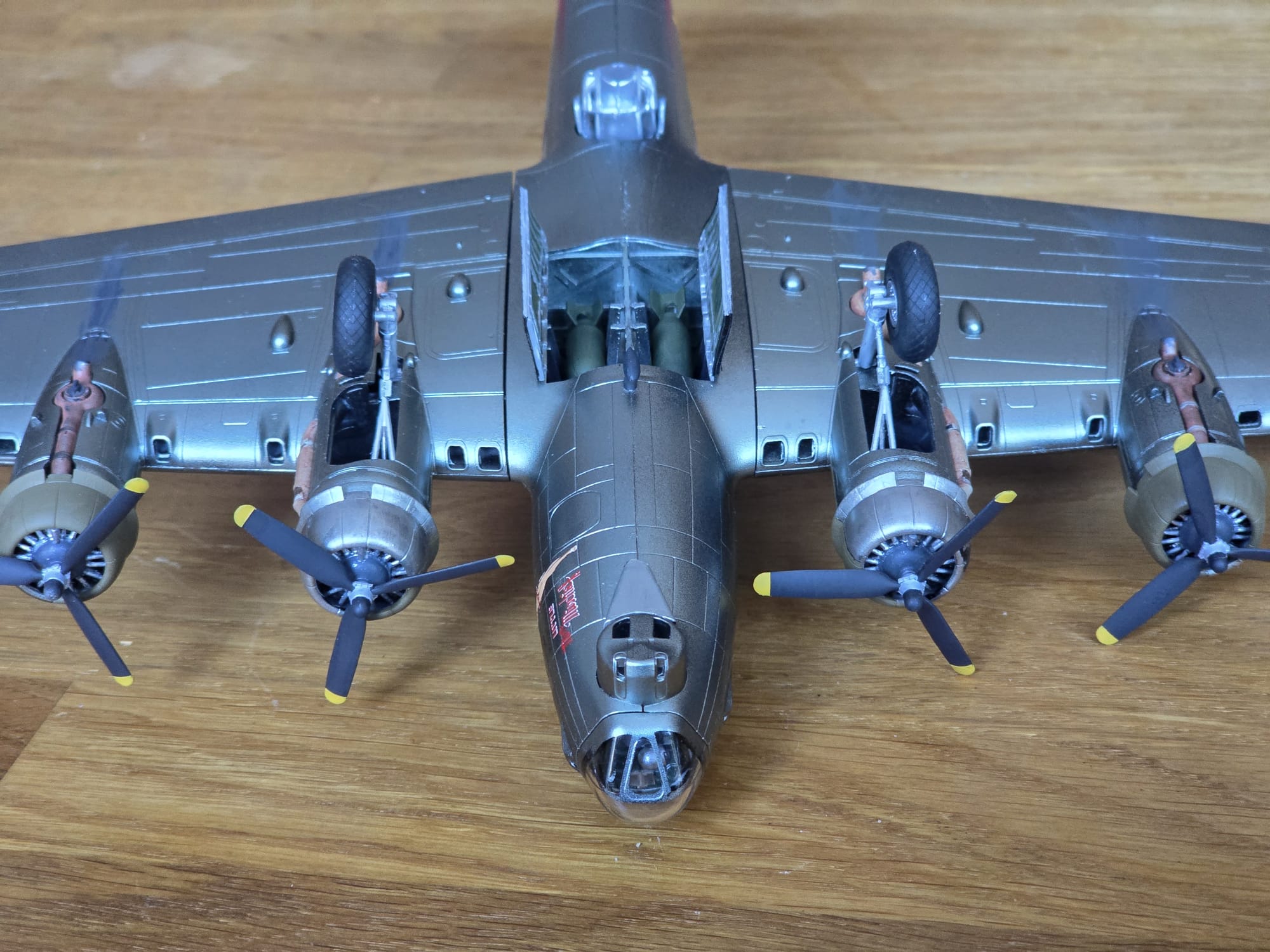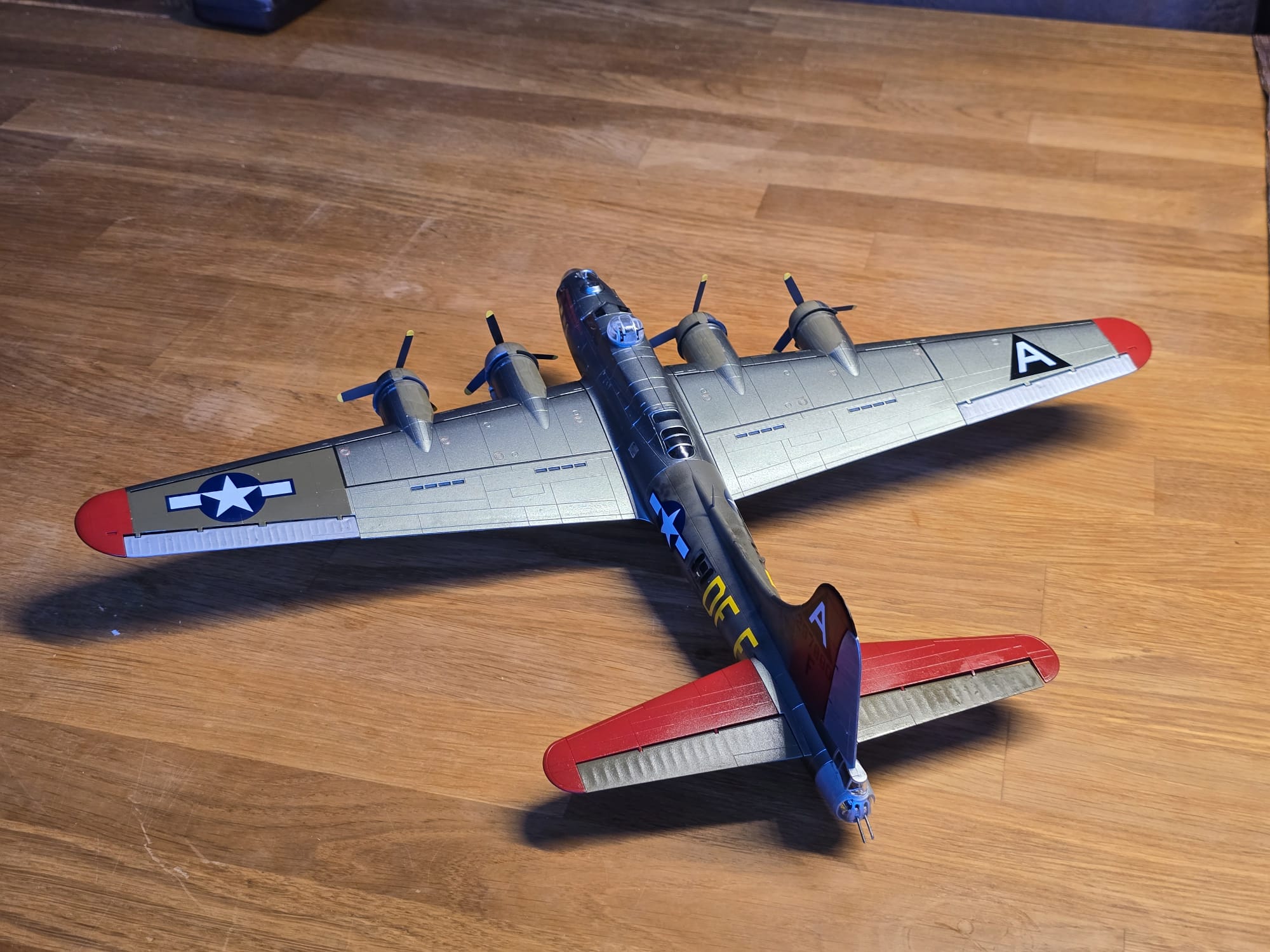 Die B17G ist fertig. Eine wirklich schöne Maschine. Ich verstehe nur die bunte Farbgebung für eine Kriegsmaschine nicht, die nach meinen Recherchen genauso geflogen ist.
