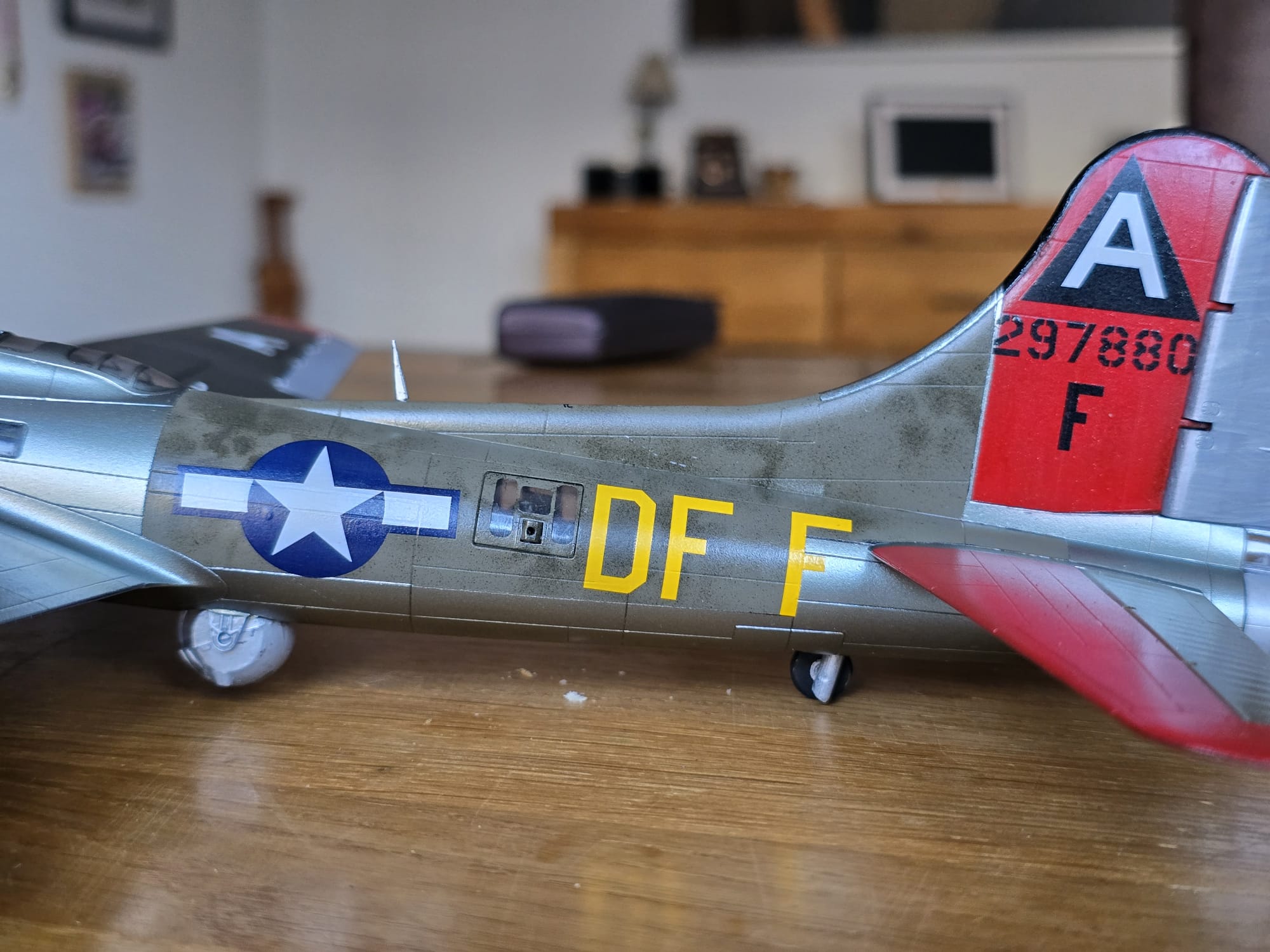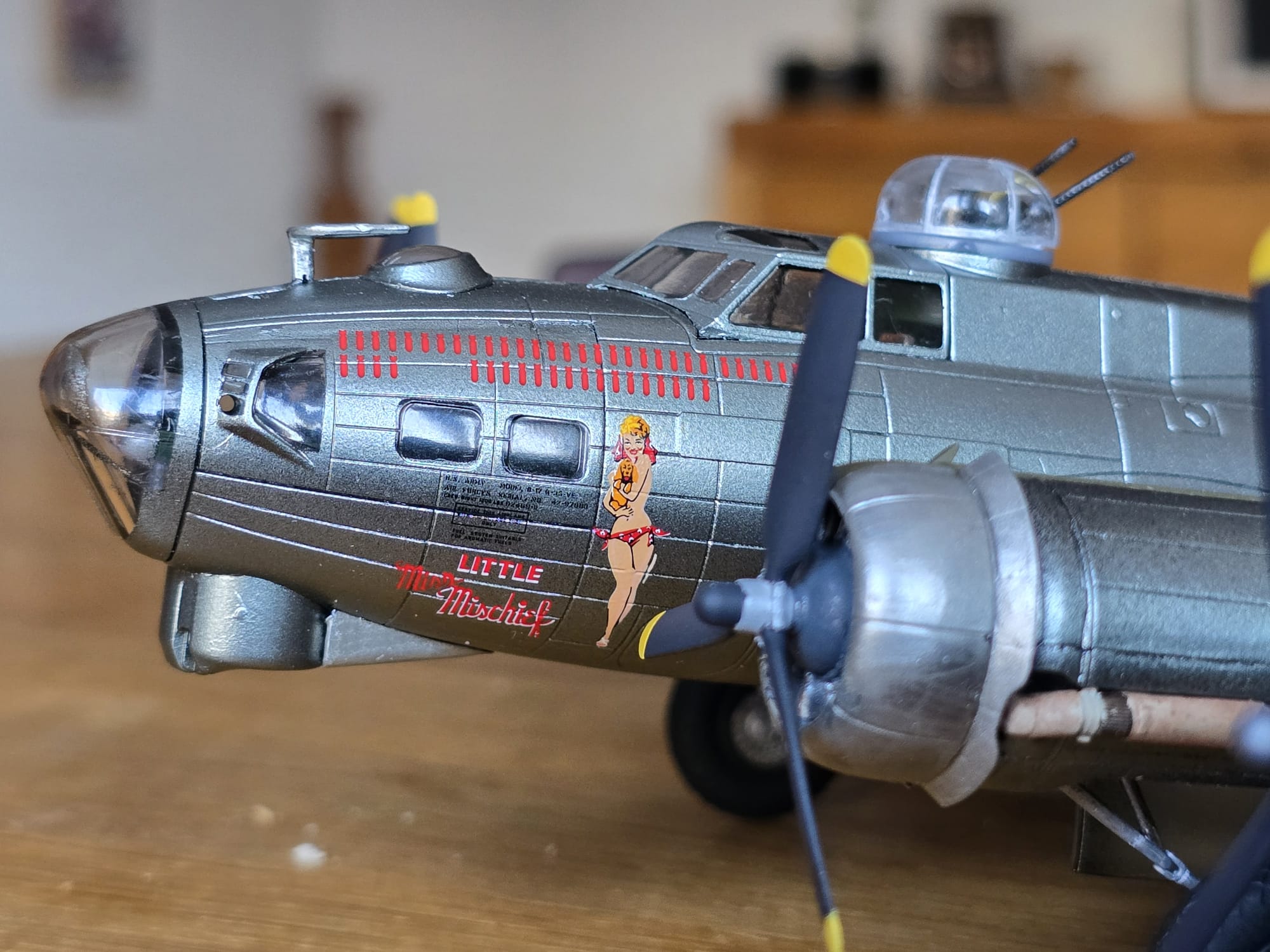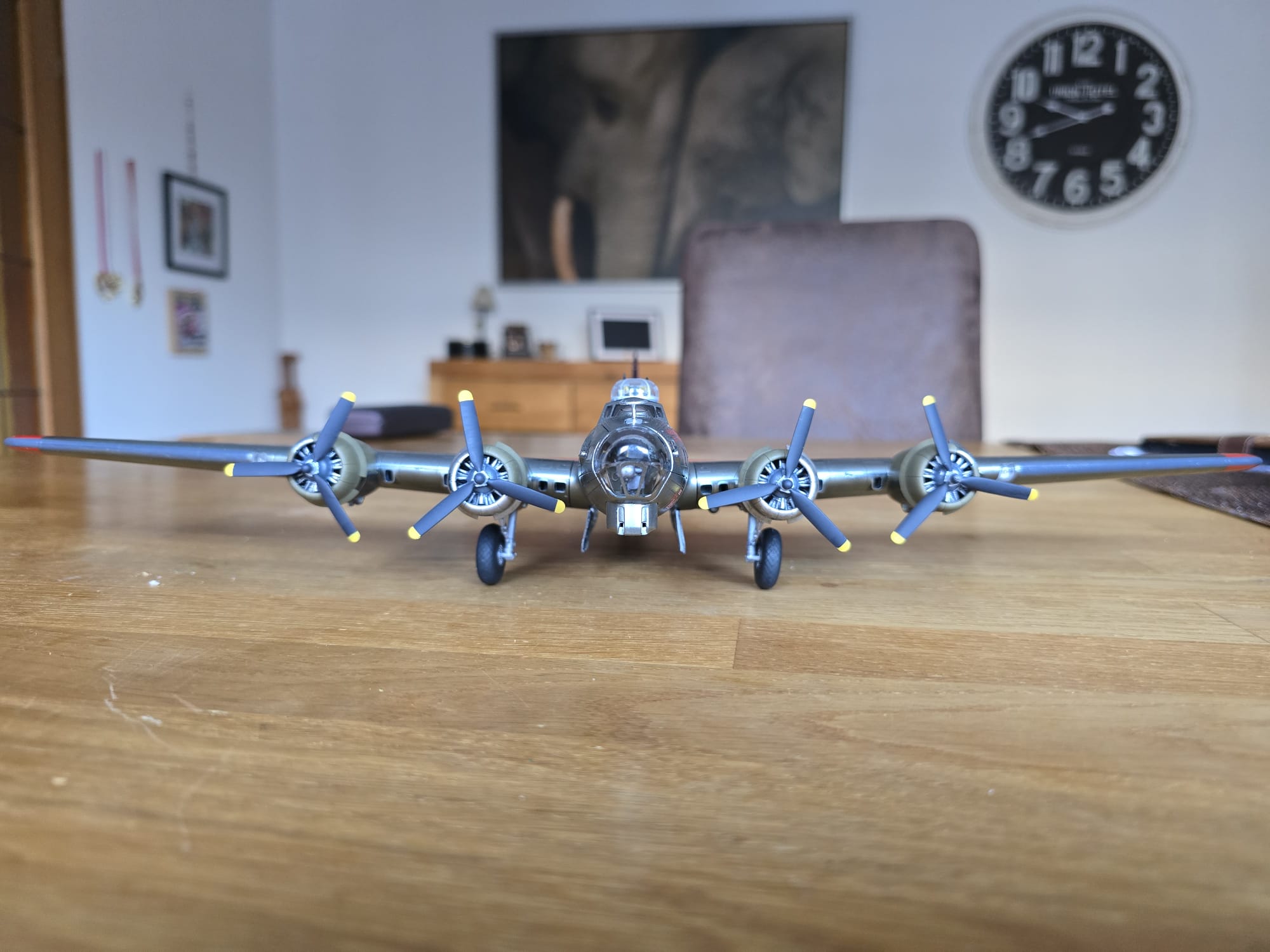 Die B17G ist fertig. Eine wirklich schöne Maschine. Ich verstehe nur die bunte Farbgebung für eine Kriegsmaschine nicht, die nach meinen Recherchen genauso geflogen ist.
