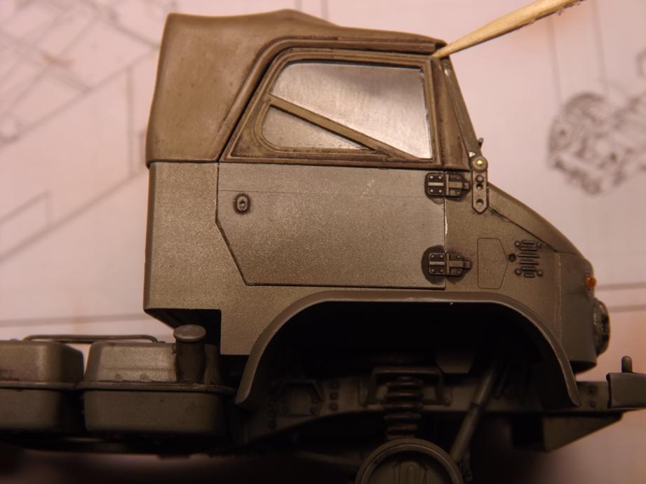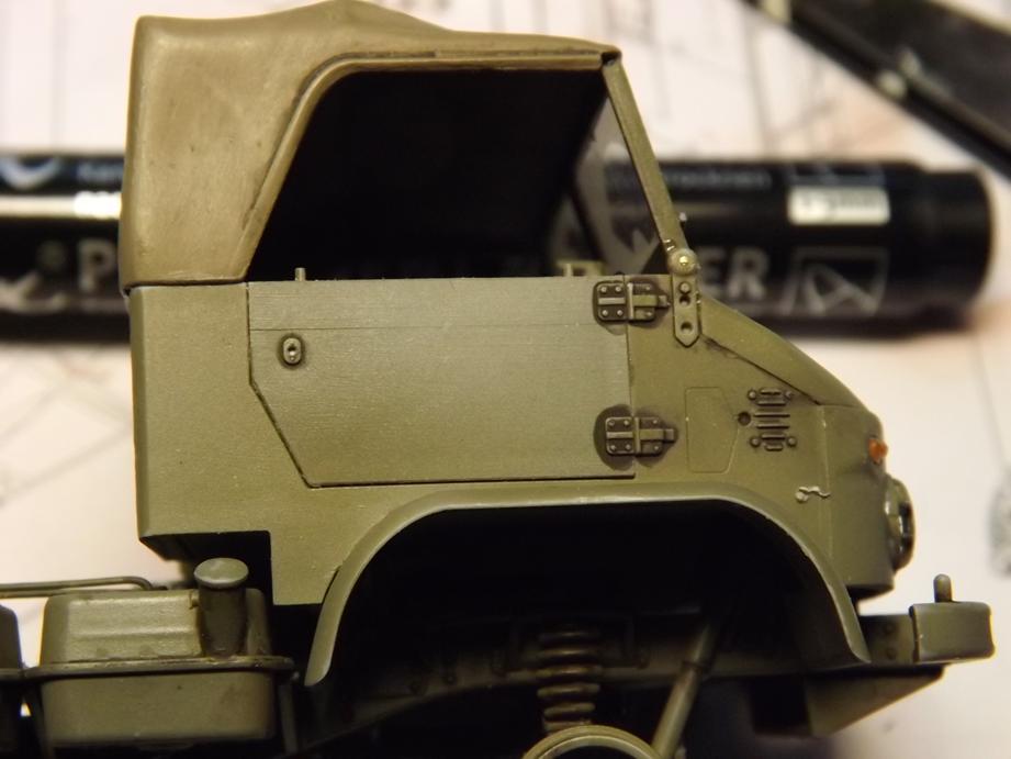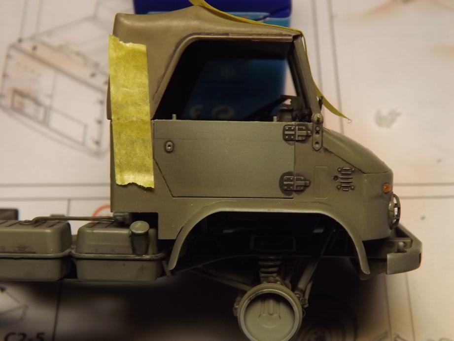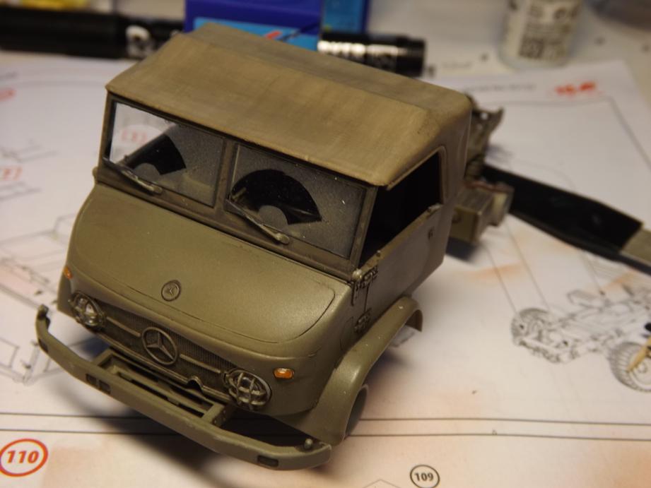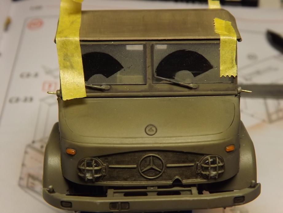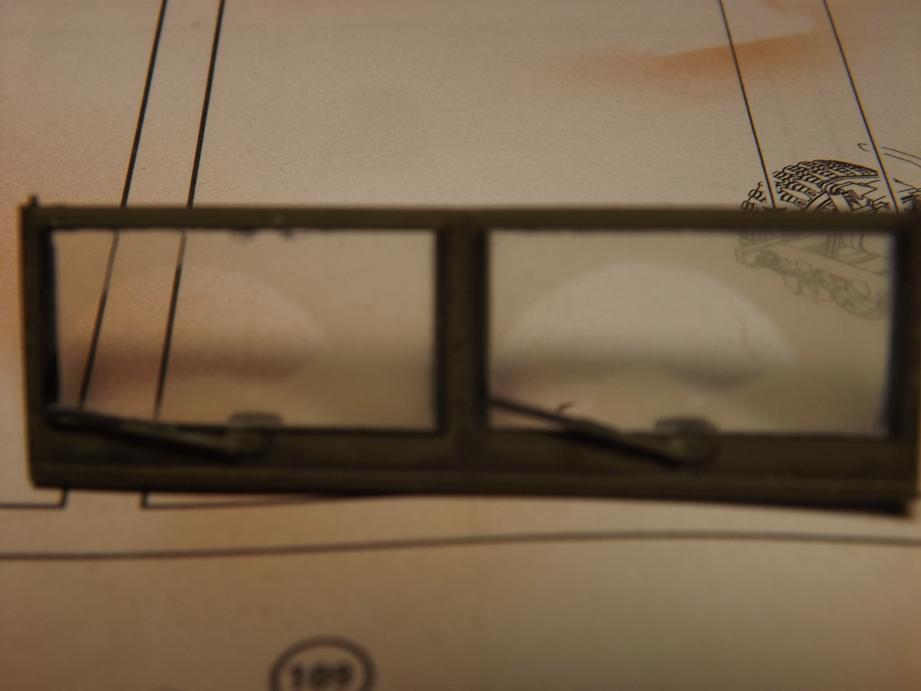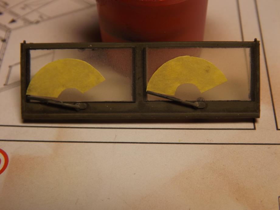 Die Frontscheibe und die Seitenscheiben übersprühte ich mit einer leichten Staubschicht in Sandfarbe und entfernte danach die Masken.