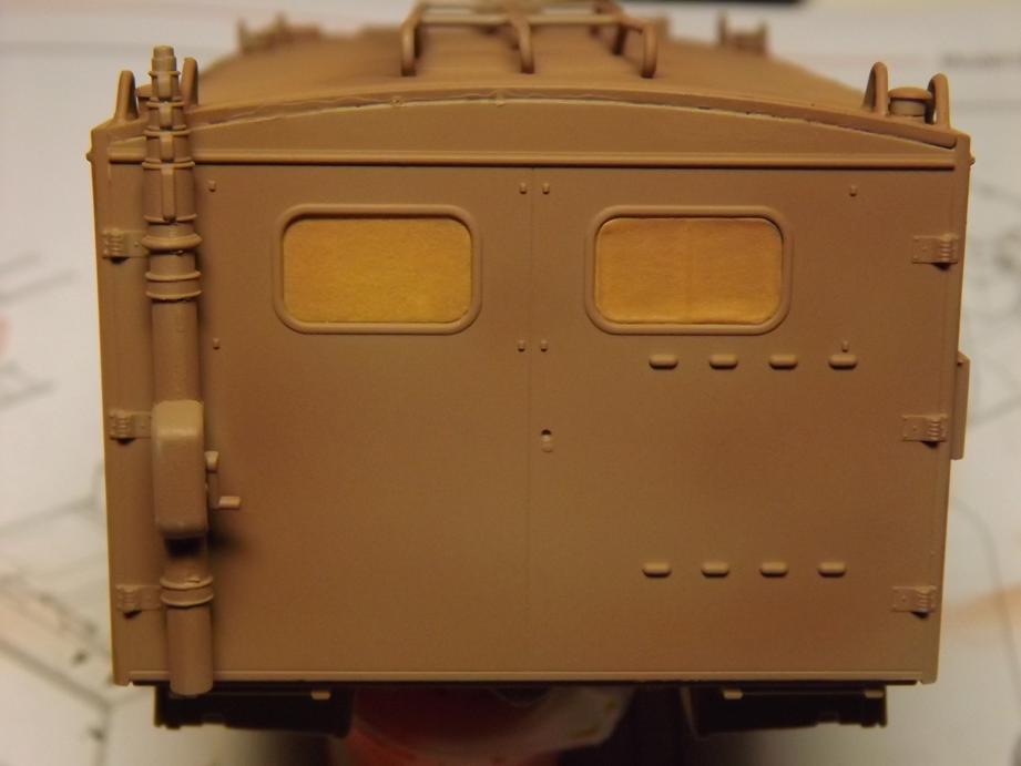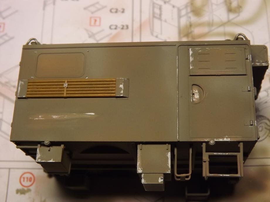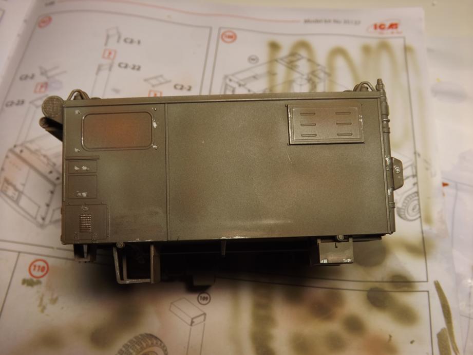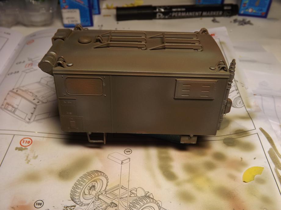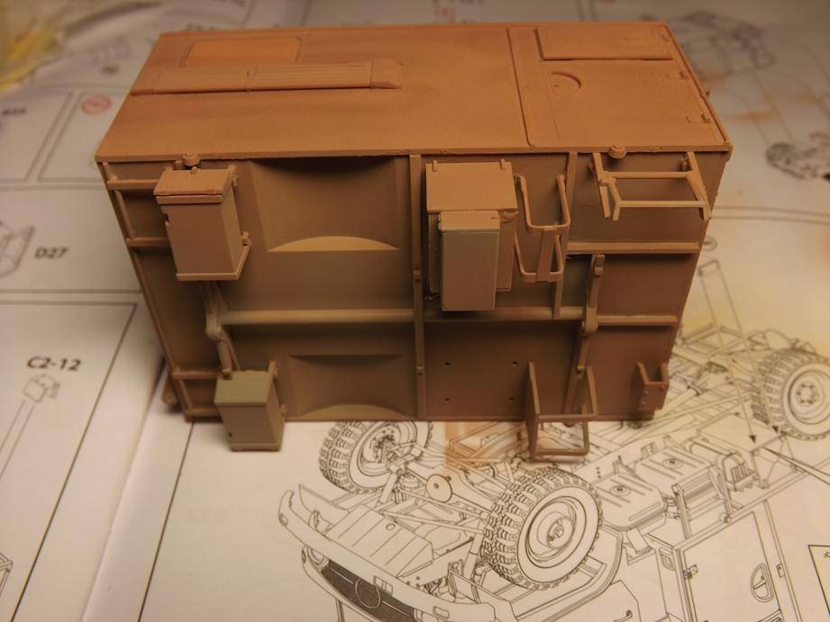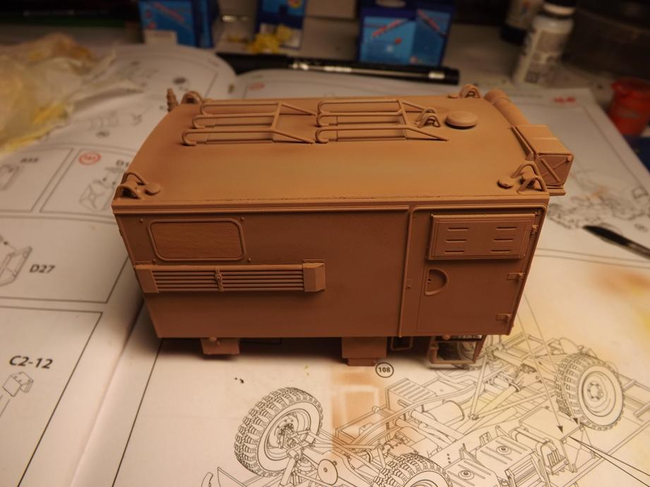 Über den jetzigen Bauzustand sprühte ich Klarlack in feinem Nebel, um den Kofferaufbau für das Washing vorzubereiten. Das ist der nächstfolgende Schritt. Durch den Klarlack kommt die Schattierung aus durchscheinender Grundierung und Aufhellungen stärker zur Geltung. Ich hoffe, dass das bei der Endversiegelung mit mattem Klarlack wieder etwas gemildert wird. Da lass ich mich ´mal überraschen.