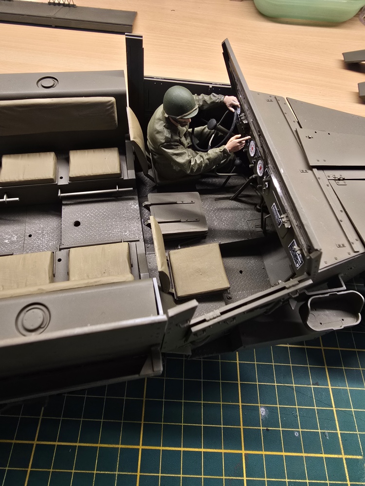Laut Bauplan muss in die Fahrerkabine auch der Fahrer relativ zu Anfang mit eingebaut werden . Dieser liegt dem Bausatz auch bei . Leider aber nur eine Figur .2 bis 3 wären viel schöner gewesen. Auch hab ich noch nicht wirklich US Soldaten in 1/16 gefunden .