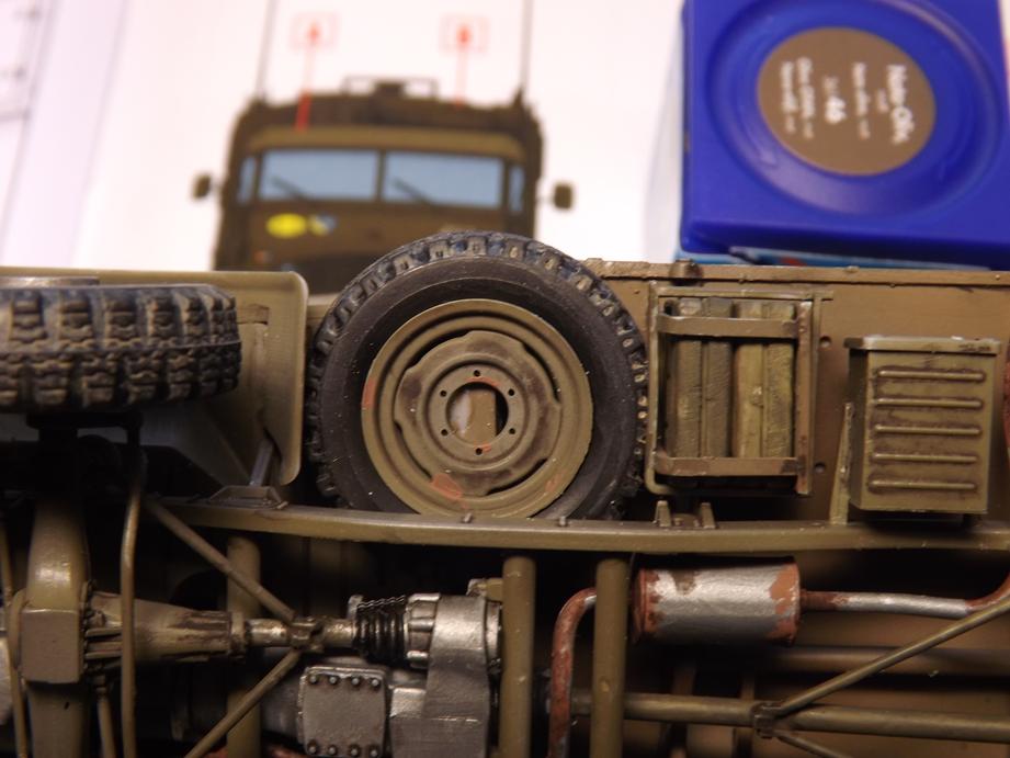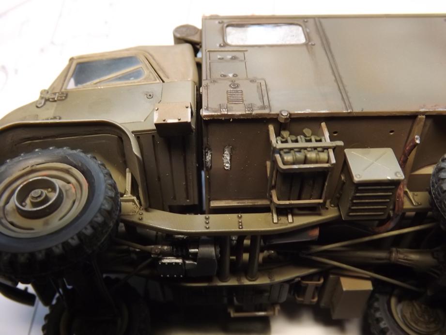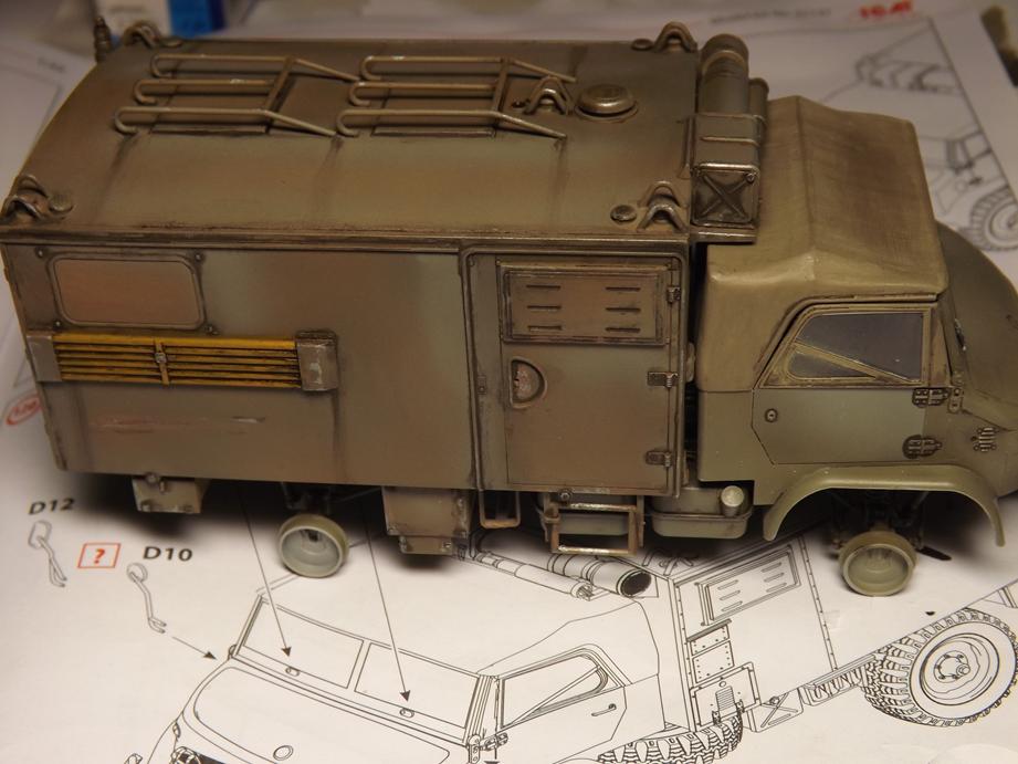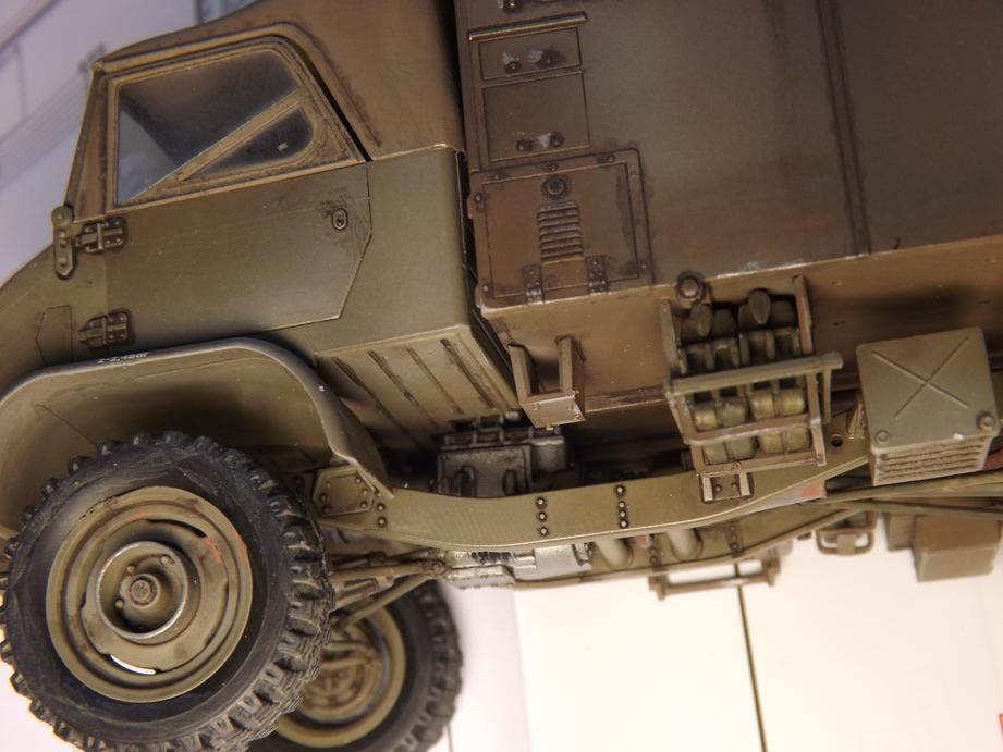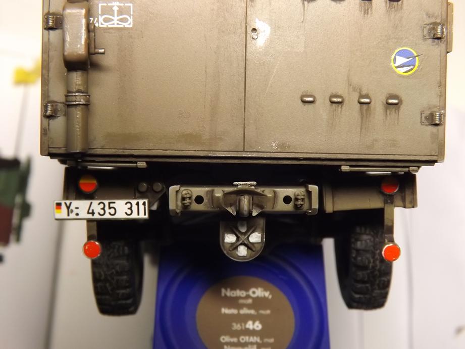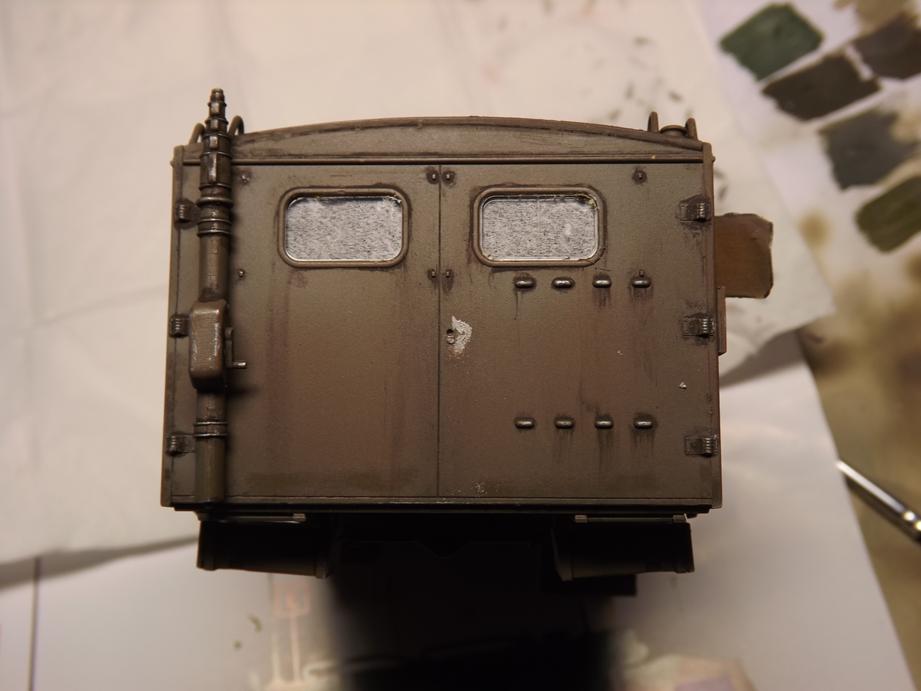Über den jetzigen Bauzustand sprühte ich Klarlack in feinem Nebel, um den Kofferaufbau für das Washing vorzubereiten. Das ist der nächstfolgende Schritt. Durch den Klarlack kommt die Schattierung aus durchscheinender Grundierung und Aufhellungen stärker zur Geltung. Ich hoffe, dass das bei der Endversiegelung mit mattem Klarlack wieder etwas gemildert wird. Da lass ich mich ´mal überraschen.