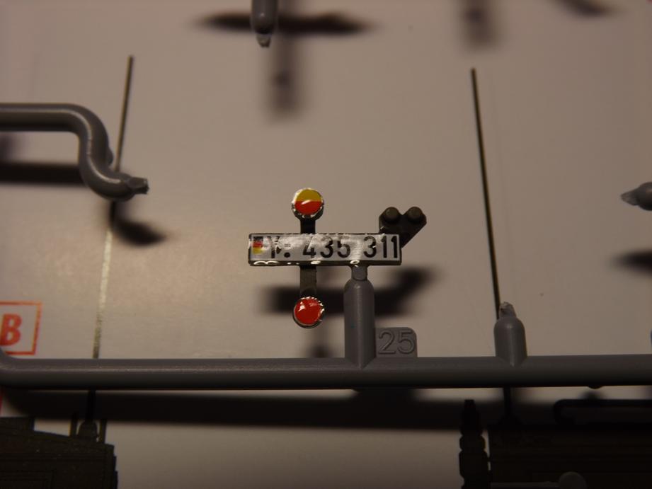 Im folgenen Schritt bemalte ich die Halter für Rücklichter und Kennzeichen, fügte die Decals für die Rücklichtgläser sowie das Kennzeichen bei, alterte das Ganze, versiegelte mit mattem Klarlack und bemalte die Lampengläser mit glänzendem Klarlack. Auf den Fotos ist der Decalsofter zu erkennen, den ich unmittelbar zuvor aufbrachte. Nach Ferstigstellung klebte ich die Teile am Fahrzeugheck an.