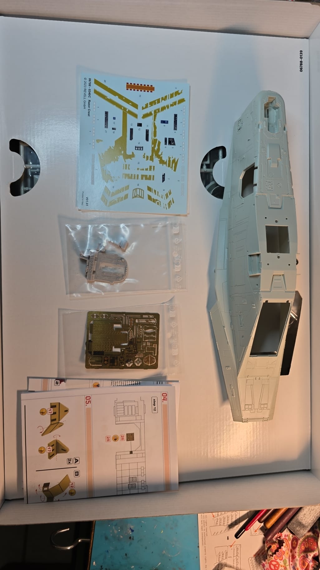 Der Bausatz besteht im wesentlichen aus dem stabilen Karton, einer Bauanleitung, 6 Spritzlingen, eins davon für die Klarsichtteile, der PE-Platine, den 4 Resinteilen und den Decals.