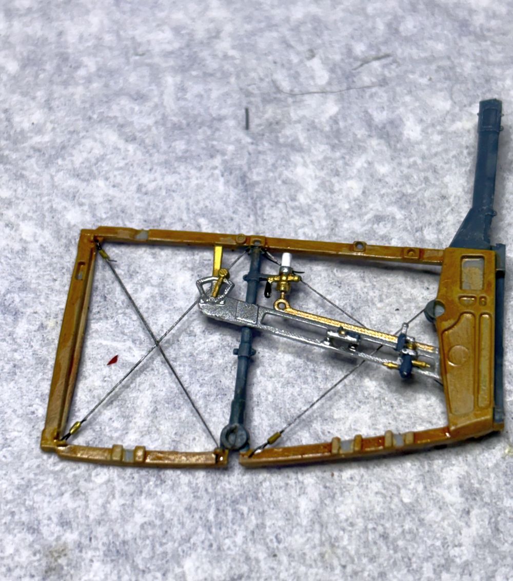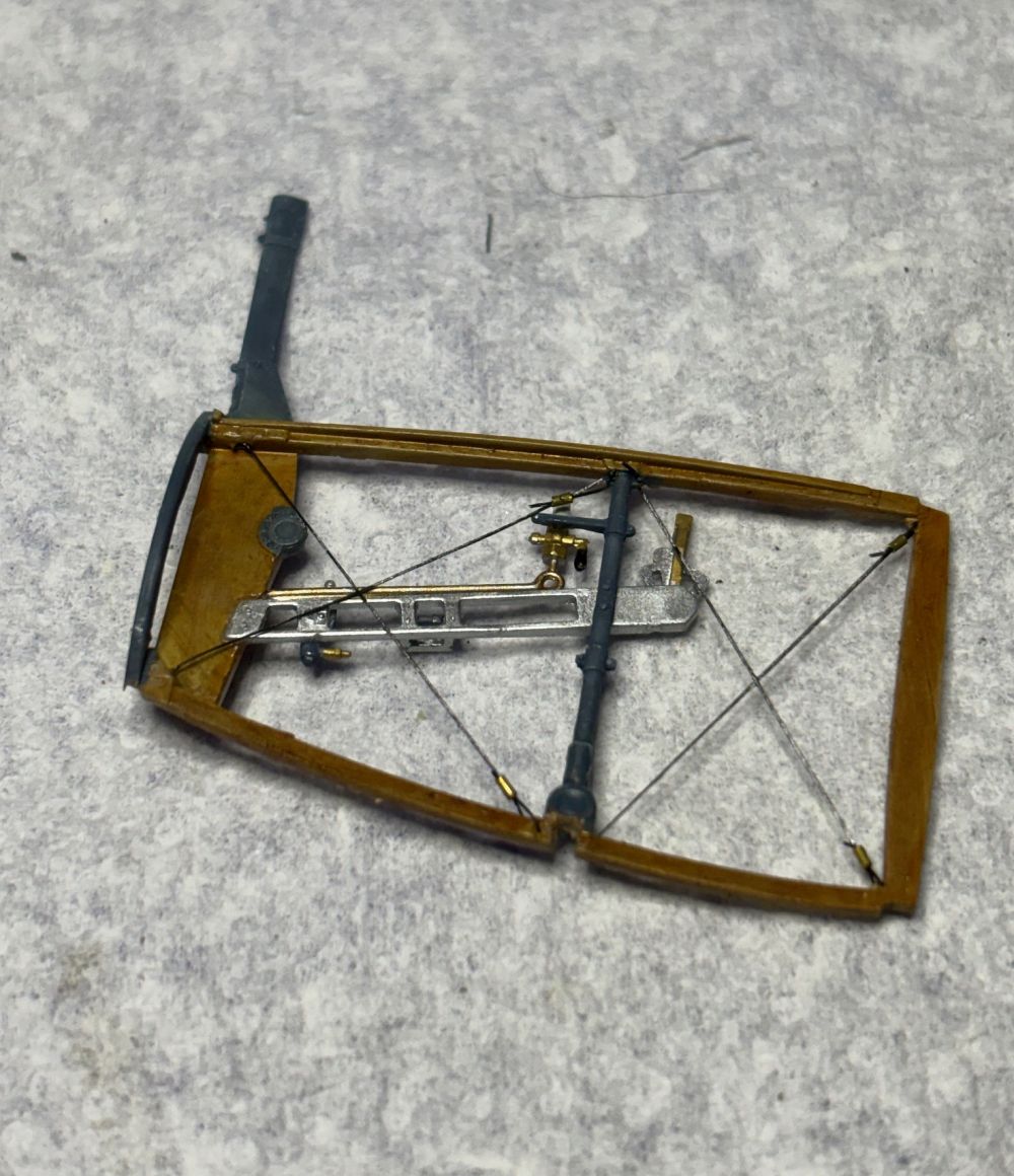 Auch habe ich die Einheit mit dem Steuerknüppel fertig. Dieser bekam bereits 2 Steuerseile verpasst. Die im Rahmen angedeuteten Löcher habe ich aufgebohrt.