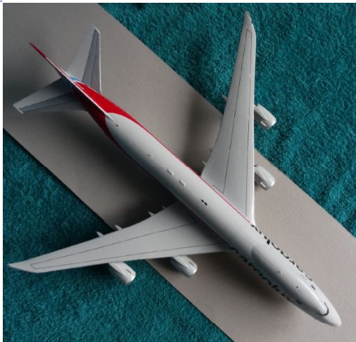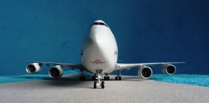 Ich weiß nicht, woran es liegt, aber die Triebwerke hängen arg tief über dem Boden. Eine Bildersuche bei Google zeigt denn auch, dass die inneren Triebwerke beim Original ungefähr einen halben Triebwerksdurchmesser an Bodenfreiheit haben, die äußeren fast einen ganzen. Davon abgesehen ist der Jumbo aber ein ansprechendes Modell geworden.