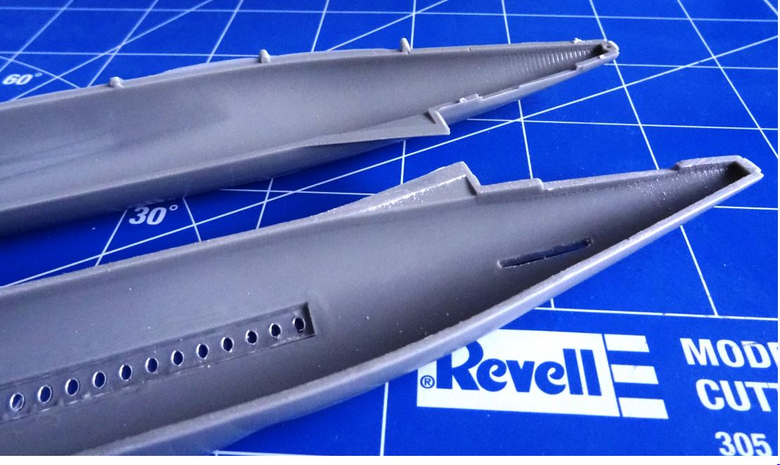 Gewöhnungbedürftig ist, dass sich die Giessäste bis auf die Klebefläche fortsetzen. Mit den Fischhäuten ist Schleifarbeit notwendig.