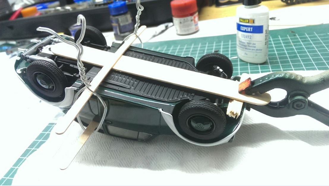 Danke schön. Gestern wurde ich annähernd fertig. Das Gleiche mit dem Klemmen habe ich vorne machen müssen. Gut, es hätte nicht unbedingt gestört, weil der Spalt ganz vorne nicht mal ein Millimeter war. Aber die Bauteile sind so gut geformt, dass man das alles ohne jeglichen Spalt zusammen bekommen kann. Ich werde es beim Cabrio wieder sehe, welches ich als Nächstes beginne, ob das da genau so ist. Also wieder gebastelt und geklemmt: