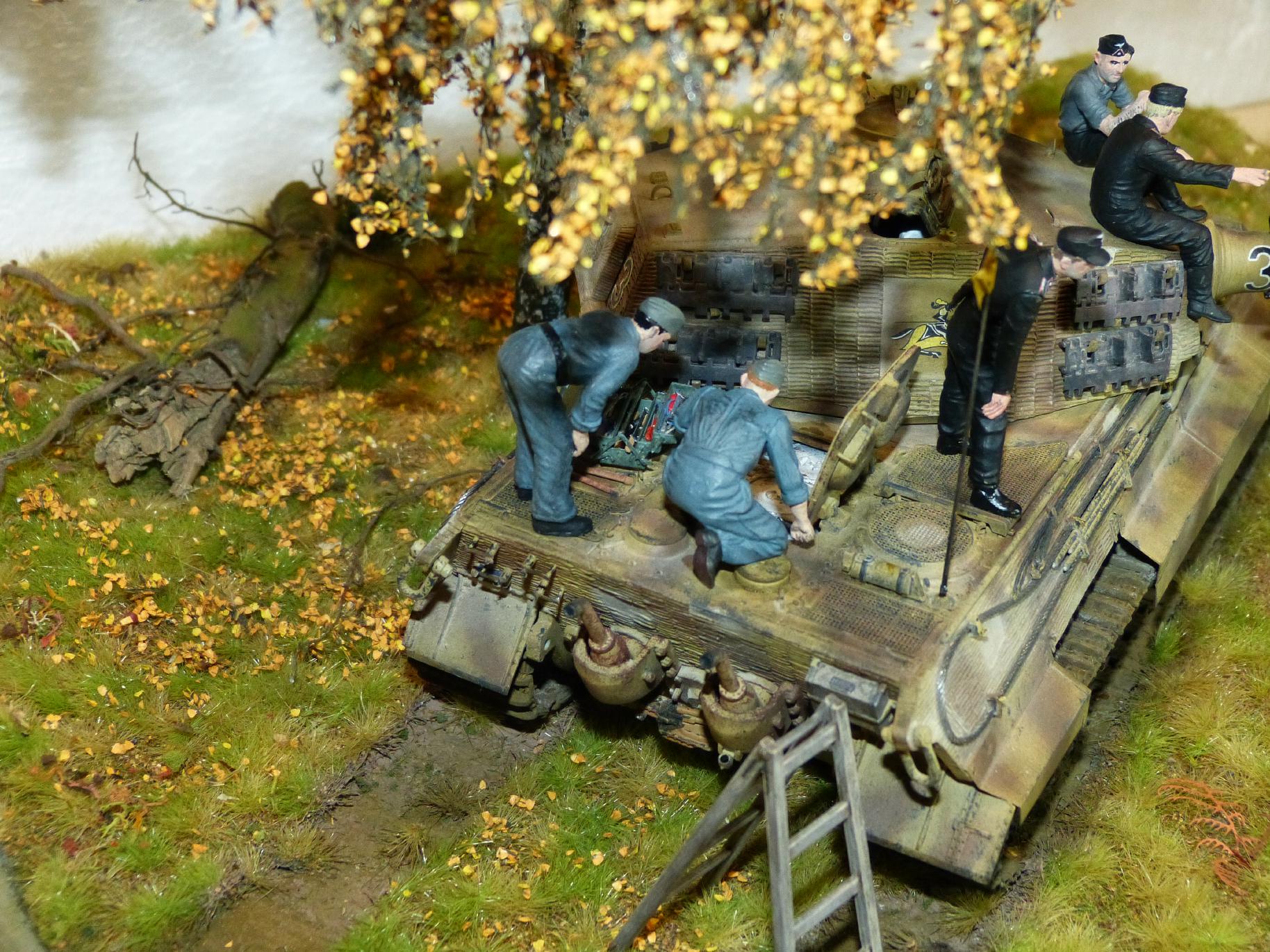 Der Tiger ist der Dragon-Bausatz 6840 mit Schürzen von Eduard, Antenne von RB-Model, Motor von Tamiya. Der Kübelwagen ist der Tamiya-Bausatz 35213 mit Ätzteilen von Eduard. Figuren stammen von ICM (35211), Masterbox (35160) und Tamiya (35180).