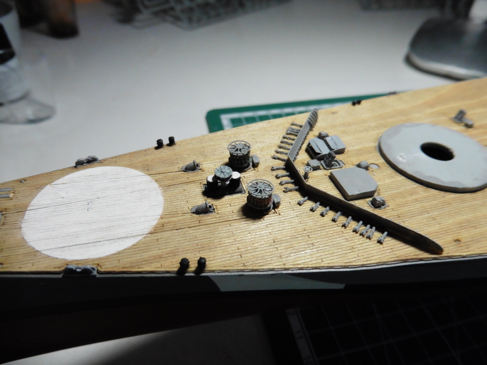Nach Bauplan wurde nun mit dem Deck und seinen Aufbauten begonnen. Hier wollten diverse Poller Aufbauten und Luken etc verbaut werden .