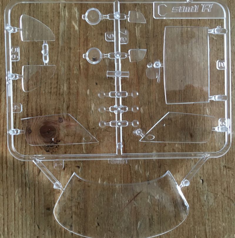 Die Karosse besteht aus vielen Teilen, so dass offene Türen, etc. darstellbar sein sollten. Die Klarsichtteile haben eine gute Materialstärke und sind klar und schlierenfrei. Für die Rader liegen Polycaps bei. Ebenso Metallfedern für die Stossdämpfer. Die Reifen aus Gummi sind prima und ohne Mittelnaht, die bei Gummi immer schlecht zu schleifen ist.