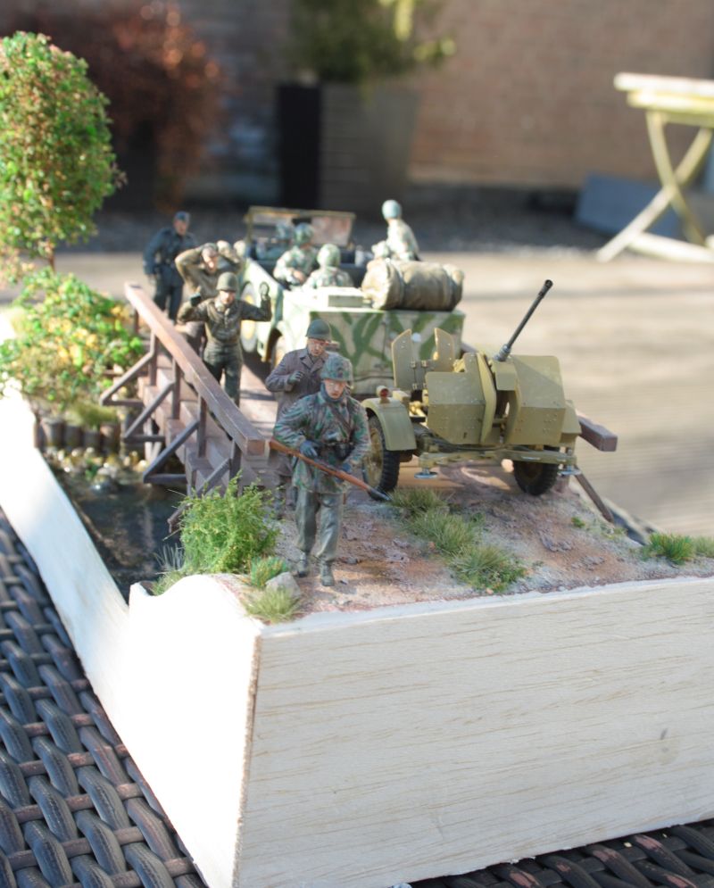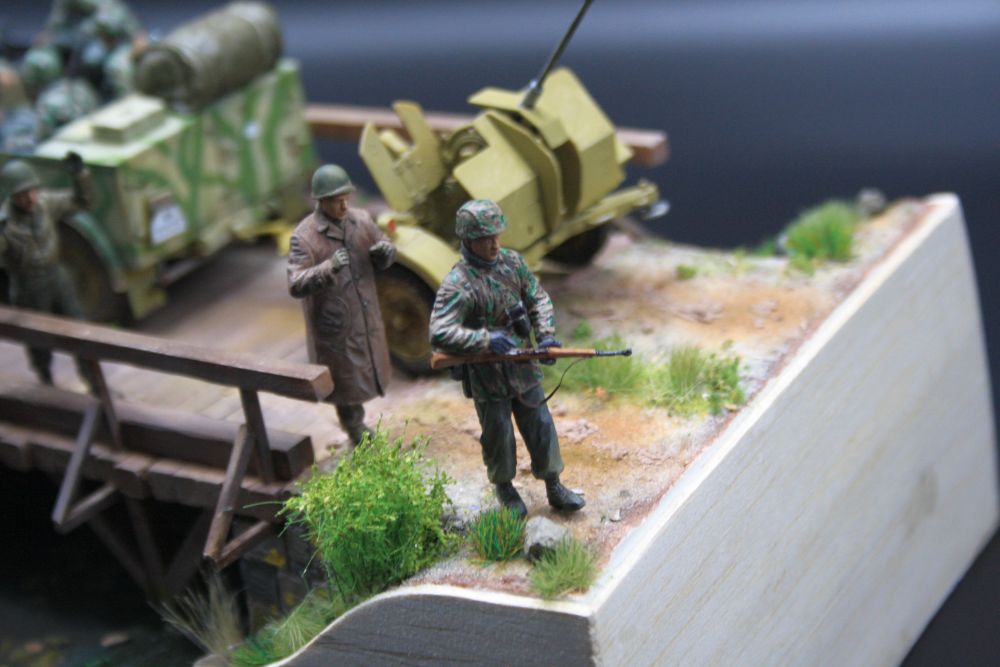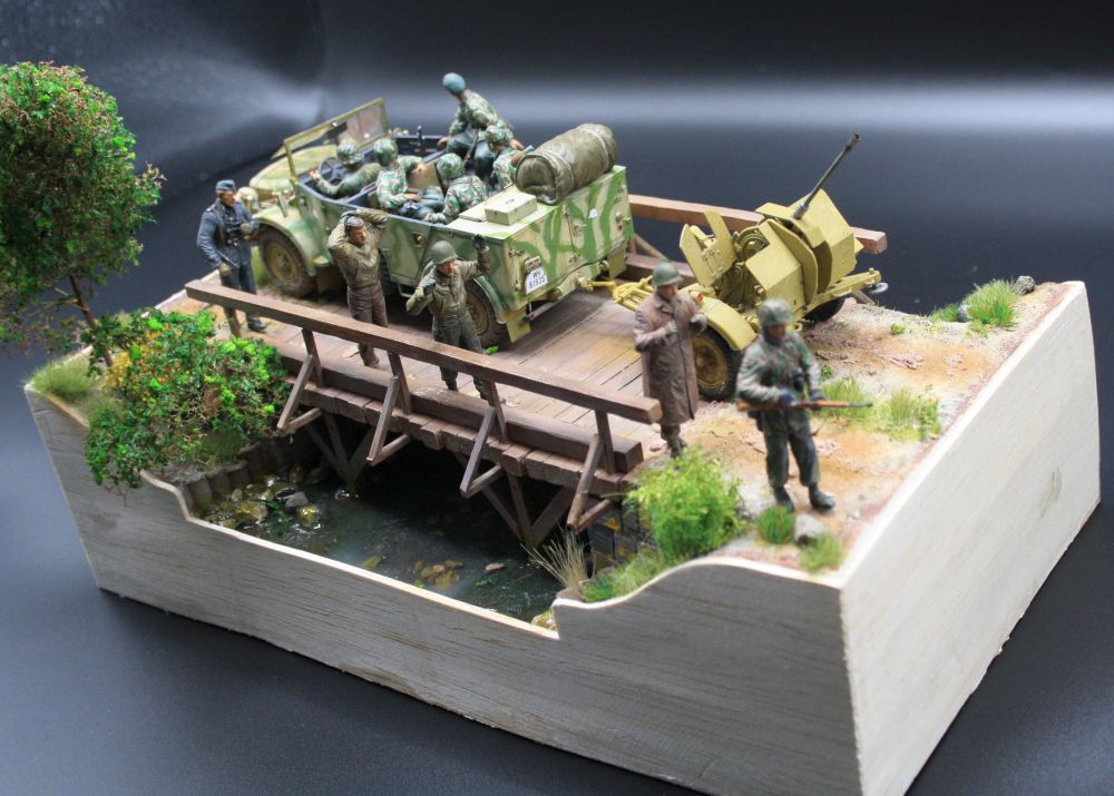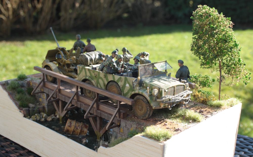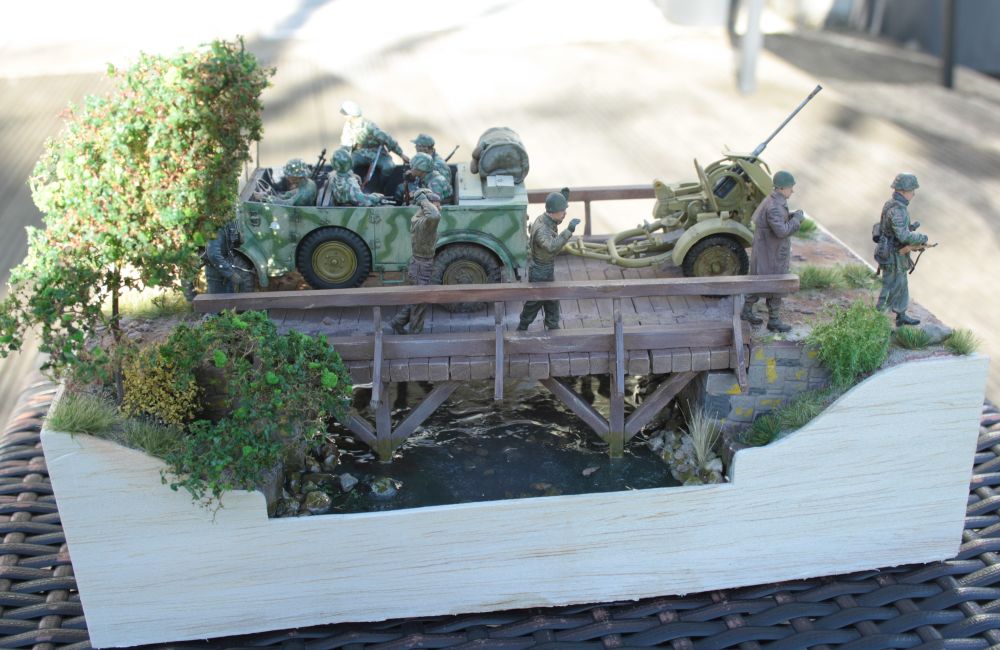 Die Brücke aus Resin und die Ufer aus Gips sind von Verlinden. Das Gelände ist mit Produkten von MIG, Vogelsand, Gips und Modellwasser von Faller entstanden. Einen Wasserlauf habe ich das erste mal gemacht und da der Untergrund nicht ganz dicht und wasserlöslich war, ist die erste Füllung komplett durchgesickert und hat eine nette Sauerei ergeben. Aber aus Schaden wird man ja bekanntlich klug.