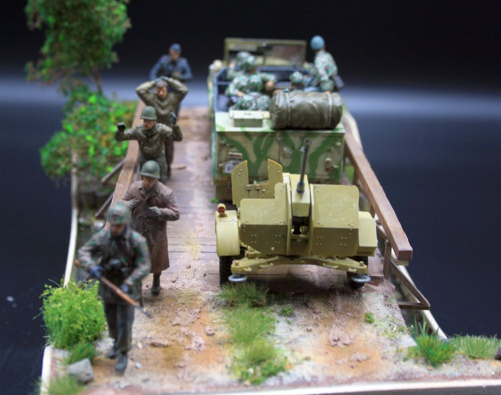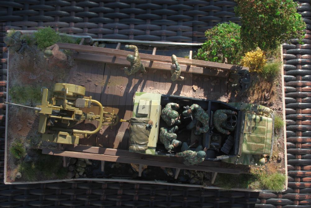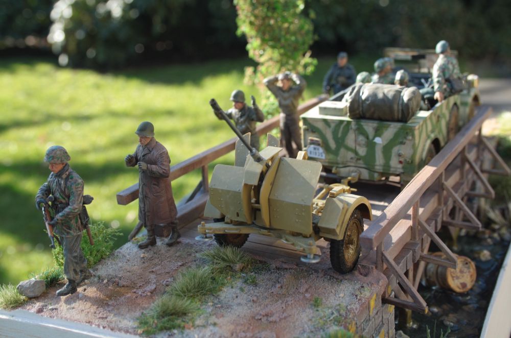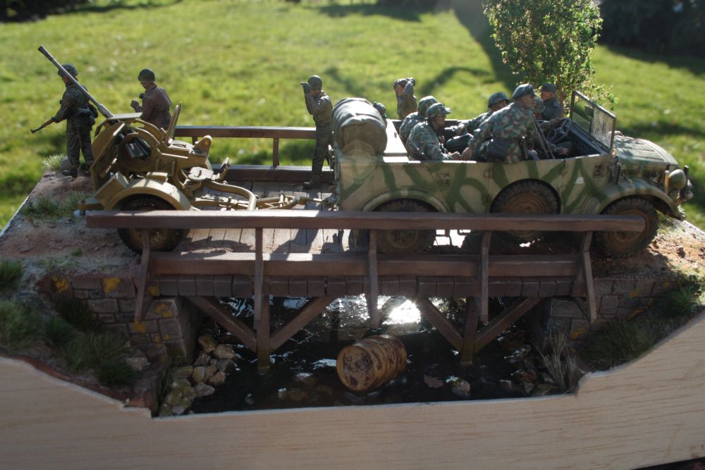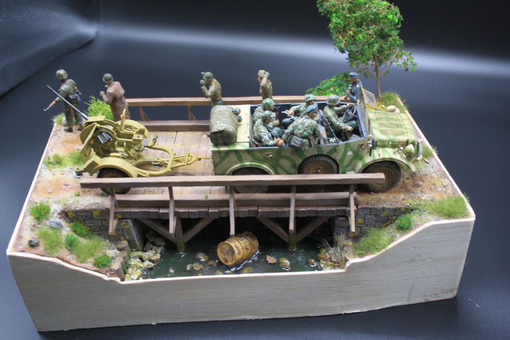 Die Brücke aus Resin und die Ufer aus Gips sind von Verlinden. Das Gelände ist mit Produkten von MIG, Vogelsand, Gips und Modellwasser von Faller entstanden. Einen Wasserlauf habe ich das erste mal gemacht und da der Untergrund nicht ganz dicht und wasserlöslich war, ist die erste Füllung komplett durchgesickert und hat eine nette Sauerei ergeben. Aber aus Schaden wird man ja bekanntlich klug.