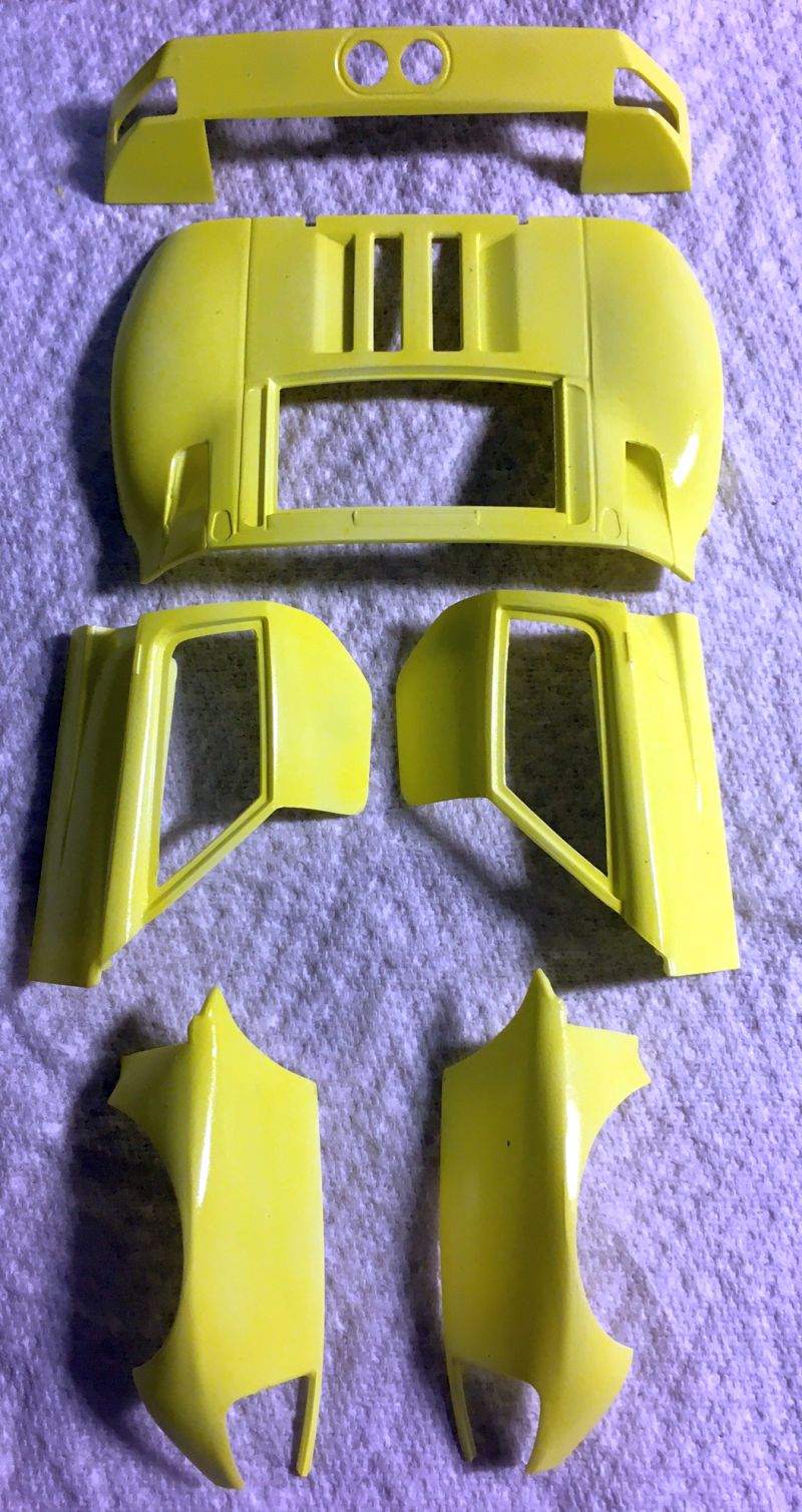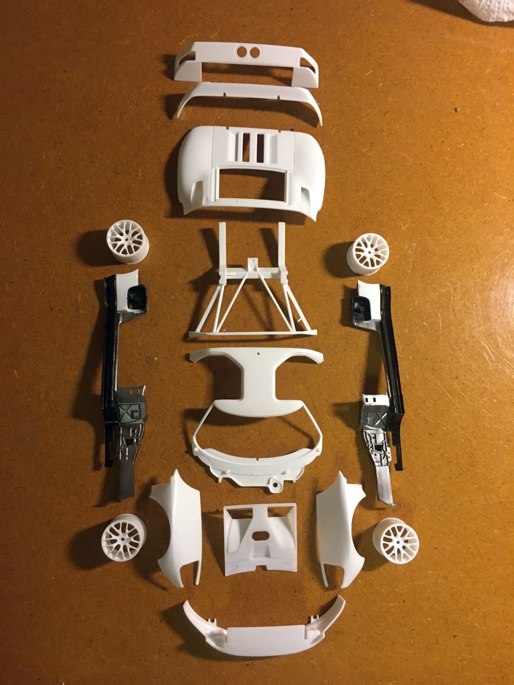 Als erste Bild zeige ich mal die beiden Schweller und die aus je 3 Teilen bestehenden Türen. Alles muss reichlich versäubert und geschliffen werden. Dazu kommt i.d.R. eine mehrfarbige Lackierung.
