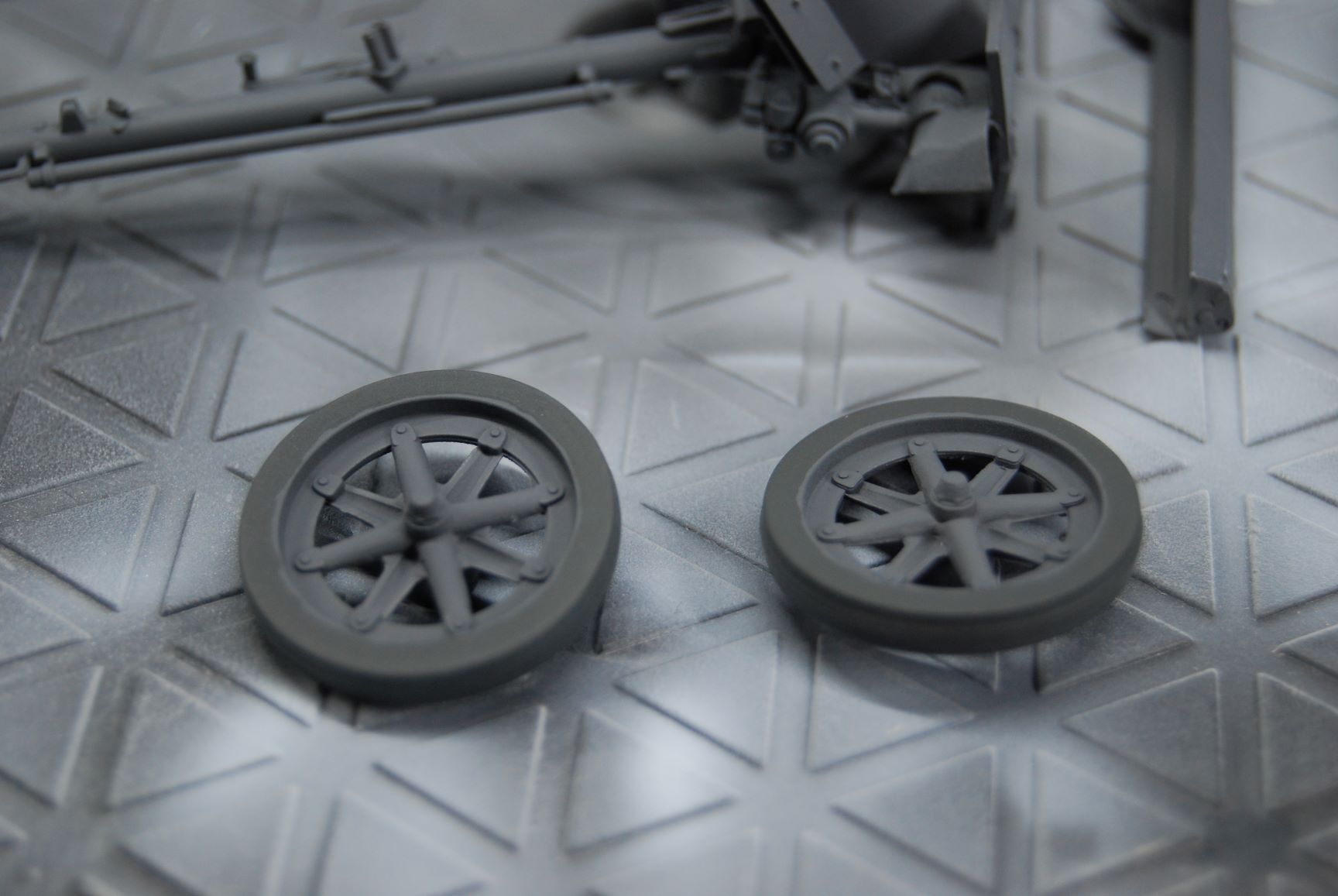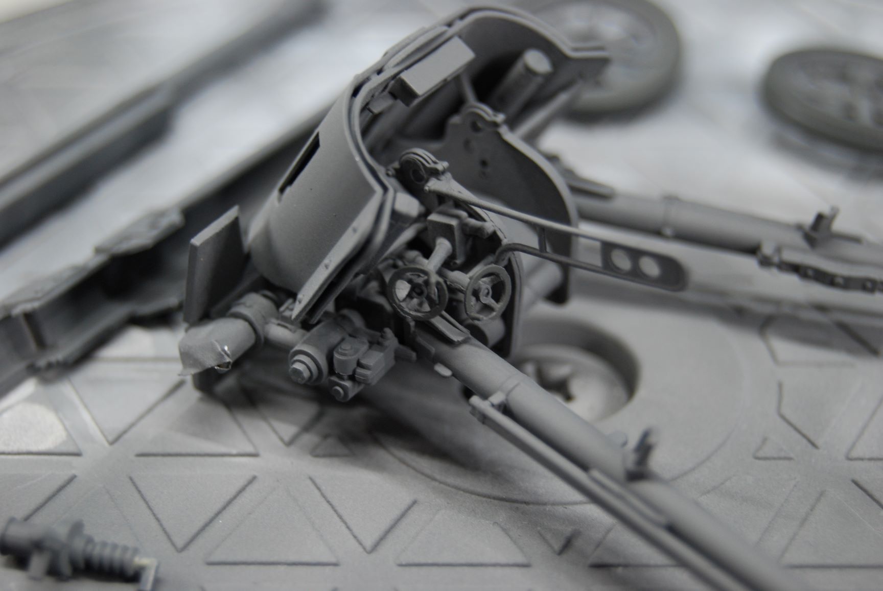 An diesem Wochenende habe ich mal an der PAK (viewtopic.php?p=88012#p88012) ein wenig weiter gearbeitet. Mit Tamiya XF-63 (German Grey) habe ich den Grundanstrich gemacht. 0,3er Düse und Nadel bei 1,2 bar Arbeitsdruck. Dem XF-63 habe ich drei Teile X20-A zugefügt. Das Grau lässt sich super verarbeiten. Nur ist es mir zu dunkel. Ich kenne das Panzergrau an restaurierten Fahrzeugen deutlich heller und glänzend. Vielleicht irre ich mich und das Original ist doch genauso dunkel wie das XF-63. Für die Gummibereifung habe ich Revell Emailfarbe 09 genommen. Diese aber gepinselt.