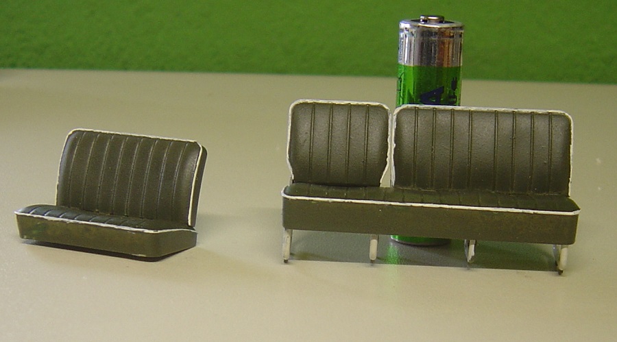 Ich habe dem Modell Windschutzscheiben spendiert und "Scheibenwischer", die eigentlich offene Dachlucke wurde mit einer VW-Golf-Felgenkappe verschlossen.