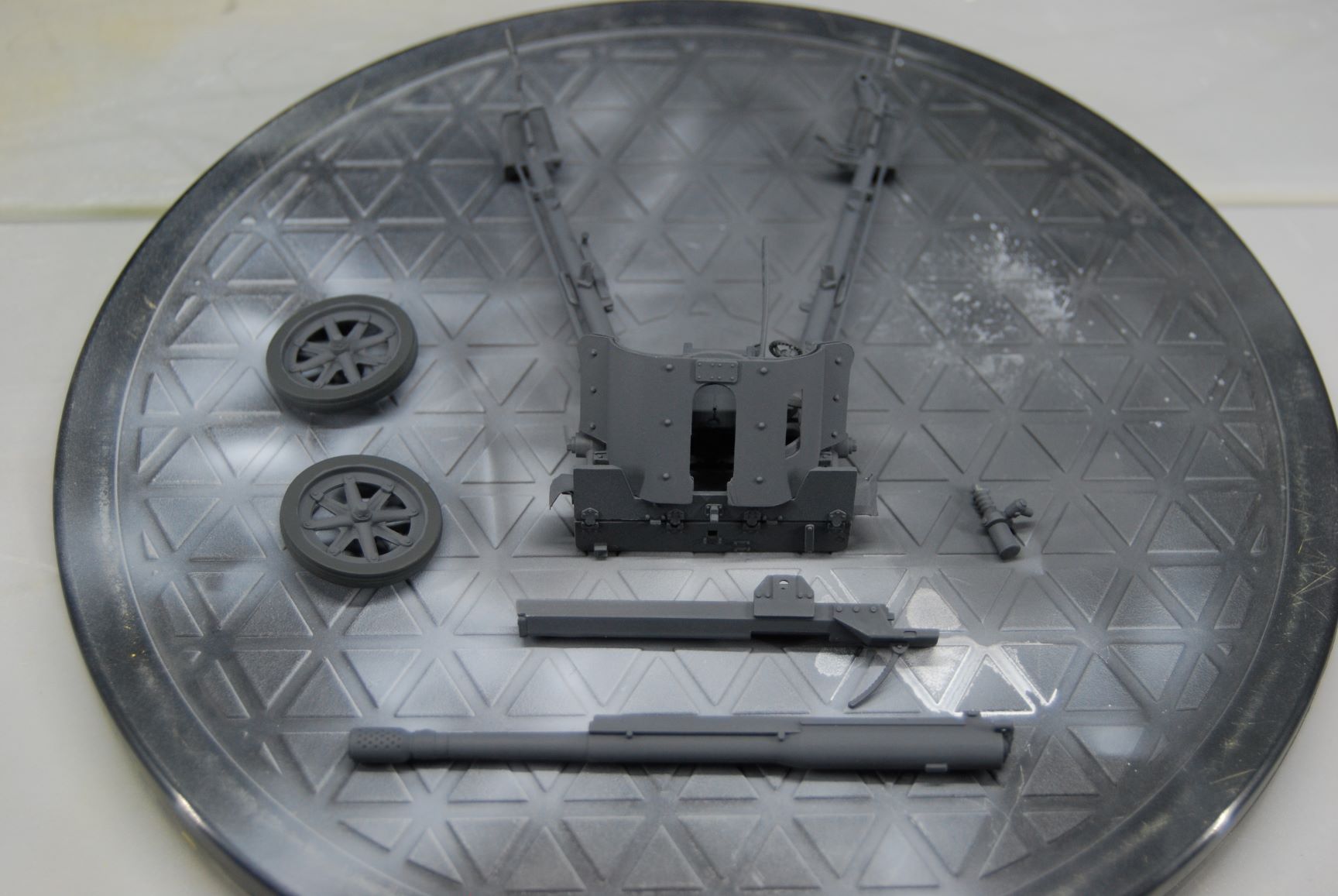 viewtopic.php?p=88012#p88012) ein wenig weiter gearbeitet. Mit Tamiya XF-63 (German Grey) habe ich den Grundanstrich gemacht. 0,3er Düse und Nadel bei 1,2 bar Arbeitsdruck. Dem XF-63 habe ich drei Teile X20-A zugefügt. Das Grau lässt sich super verarbeiten. Nur ist es mir zu dunkel. Ich kenne das Panzergrau an restaurierten Fahrzeugen deutlich heller und glänzend. Vielleicht irre ich mich und das Original ist doch genauso dunkel wie das XF-63. Für die Gummibereifung habe ich Revell Emailfarbe 09 genommen. Diese aber gepinselt.
