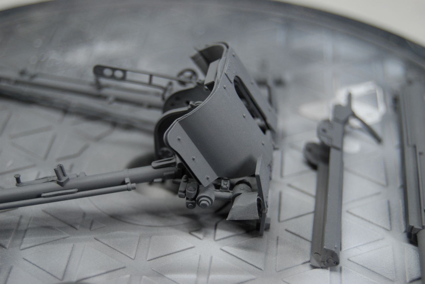 Als Schutzlack habe ich diesmal nicht den Klarlack matt von Revell genommen, sondern XF-86 von Tamiya. Diesen habe ich auch 1 zu 3 mit X20-A verdünnt und mit gleichen Einstellungen wie oben angegeben gesprüht. Das Ergebnis ist absolut top. Farbe und Klarlack von Tamiya lassen sich für mein Empfinden deutlich besser verarbeiten als die Emailfarben. Auf den Bildern sieht es zwar so aus, als ob da weiße Pigmente oder Staub auf der Oberfläche gelandet sind, aber beides ist definitiv nicht vorhanden. Liegt wohl an der Einstellung der Kamera in Verbindung mit der LED Beleuchtung. Das Panzergrau wirkt in der Realität auch deutlich dunkler als auf den Bildern.
