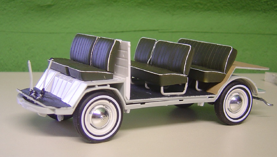 Ich habe dem Modell Windschutzscheiben spendiert und "Scheibenwischer", die eigentlich offene Dachlucke wurde mit einer VW-Golf-Felgenkappe verschlossen.